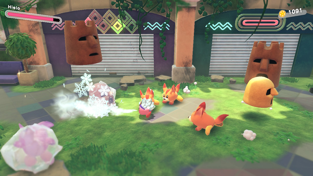 Y fuera de los niveles hay mucho más que hacer ya que el propio mapamundo de este nuevo planeta está repleto de detalles y de acciones que podemos realizar. Será a través de aquí donde podremos visitar la aldea de los Waddle Dees. Este sitio se convertirá en un auténtico centro de operaciones desde el cual podremos realizar diferentes acciones. A medida que vayamos avanzando en el juego y liberando a estos seres, la aldea irá creciendo y las posibilidades de realizar cosas en ella también. Así, en este lugar encontraremos, por ejemplo, una armería donde podremos mejorar nuestras habilidades de copia y subirlas de nivel; también habrá una tienda de objetos donde podremos comprar consumibles; un cine, donde disfrutar de nuevo de las cinemáticas vistas; una máquina de gachapón, donde invertiremos monemas para hacernos con una increíble colección de figuras; la propia casa de Kirby, donde podrá dormir y colocar esas figuras que ha ido adquiriendo. La cafetería, el hogar del Waddle Dee Sabio o el centro de mensajería son los otros enclaves disponibles en esta aldea.