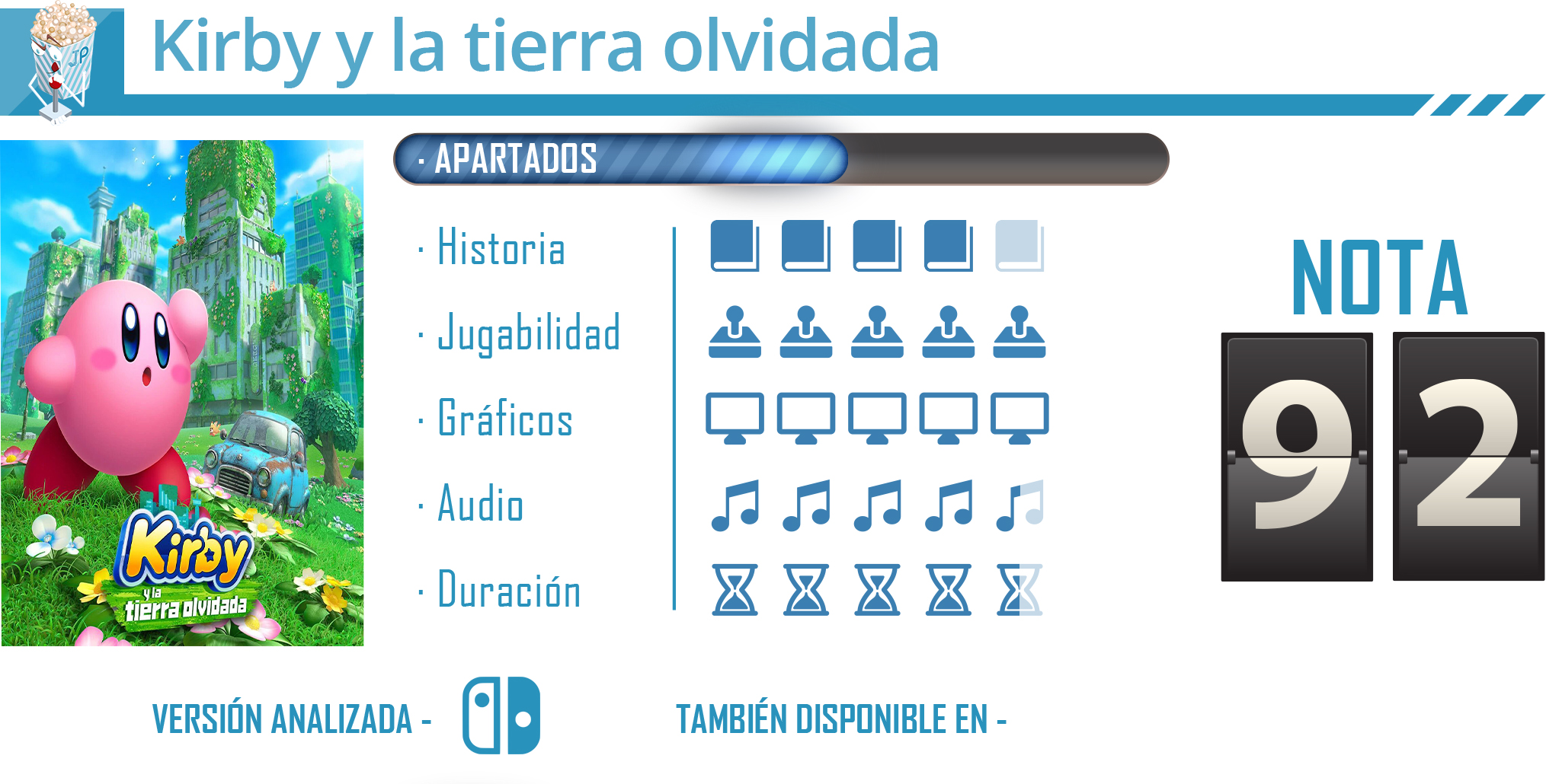 Kirby y la tierra olvidada es posiblemente, al menos para nosotros, una de las mejores y más divertidas aventuras de la bola rosa. En esta nueva aventura se muestra una evolución del personaje y sus mecánicas, añadiendo esa divertida posibilidad de engullir objetos cotidianos y transformarnos en ellos. Es un título que rebosa originalidad y diversión, y todo ello acompañado por ese simpático y característico apartado artístico y visual que hacen del juego una experiencia totalmente recomendable, ya seamos fans o no del eterno personaje ideado por Sakurai.