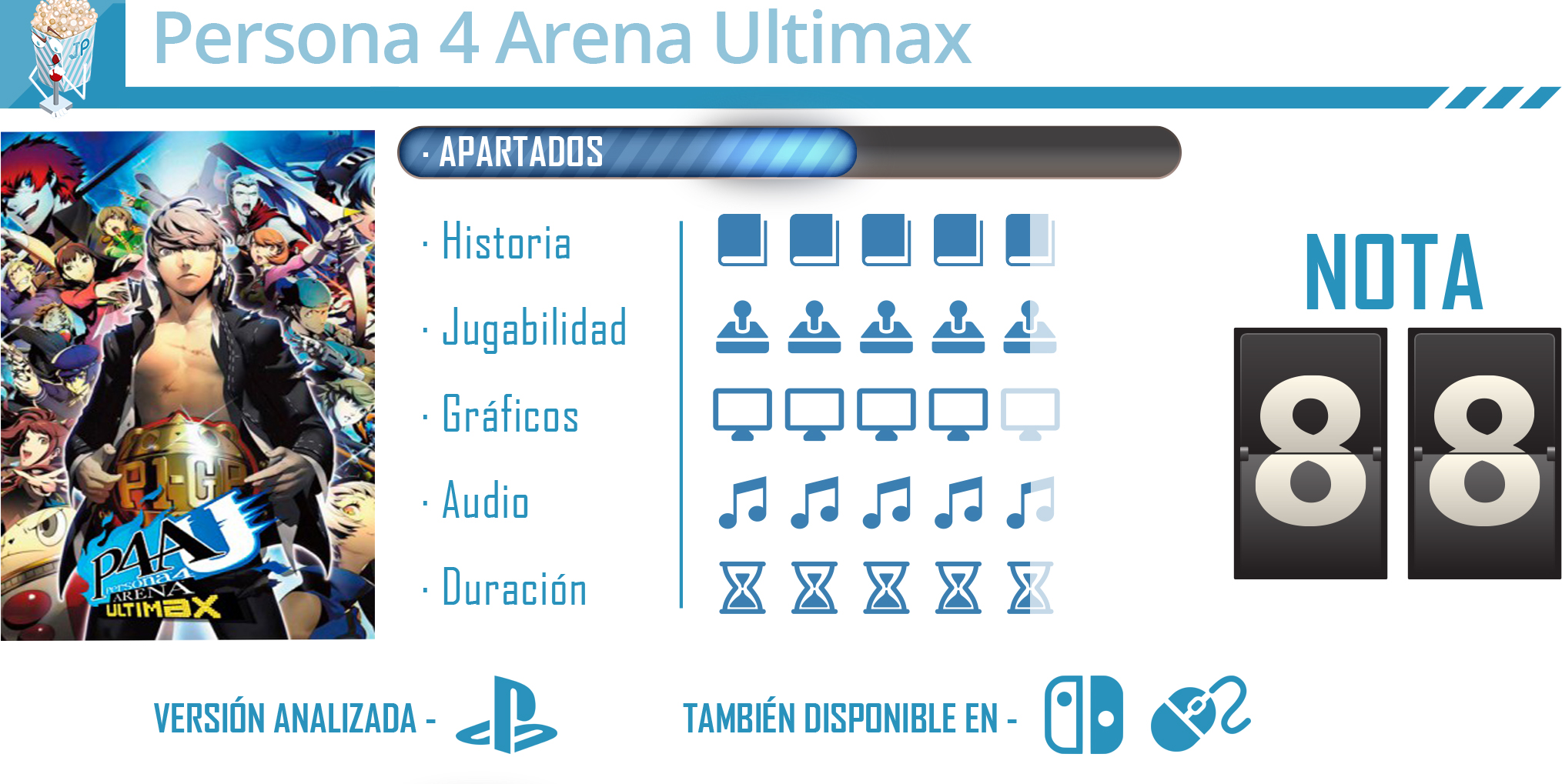 Con todos estos ingredientes Persona 4 Arena Ultimax nos ofrecerá horas y horas de diversión. Ya seamos aficionados o no a la franquicia, el sólido título de combates de Arc System Works no solo ha traído un título que ya tiene unos añitos, sino que lo ha renovado para ofrecernos una experiencia que nos mantendrá enganchados durante horas y horas.