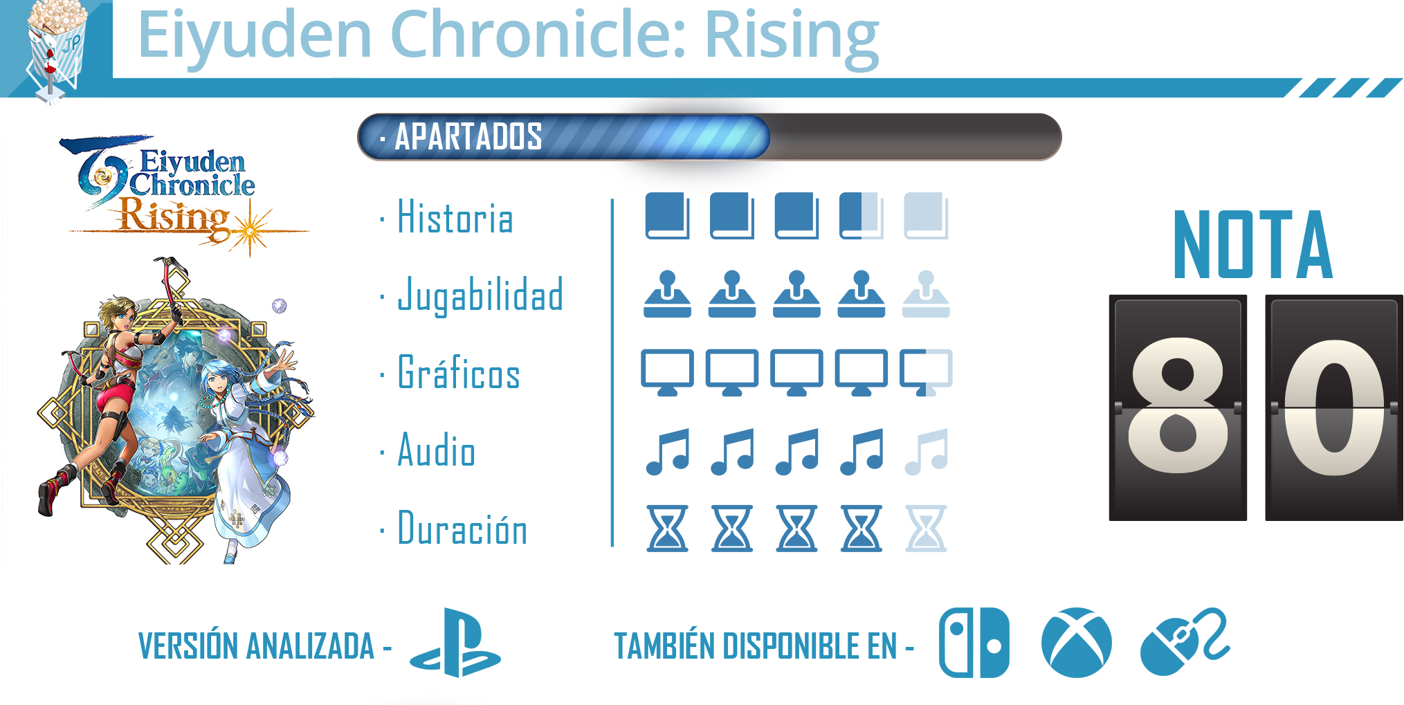 Con un desarrollo simple pero divertido, Eiyuden Chronicle: Rising es un título notable que cuenta con un apartado artístico realmente llamativo, un sistema de combate sólido y unos personajes carismáticos. Es cierto que presenta algunas limitaciones técnicas y de diseño, pero no debemos olvidar que es un título que sirve de precuela de Eiyuden Chronicle: Hundred Heroes por lo que, a grandes rasgos, consigue lo que se propone: introducirnos en un mundo de fantasía realmente atractivo y dejarnos con ganas de ver lo que está por venir en el título principal de esta saga.