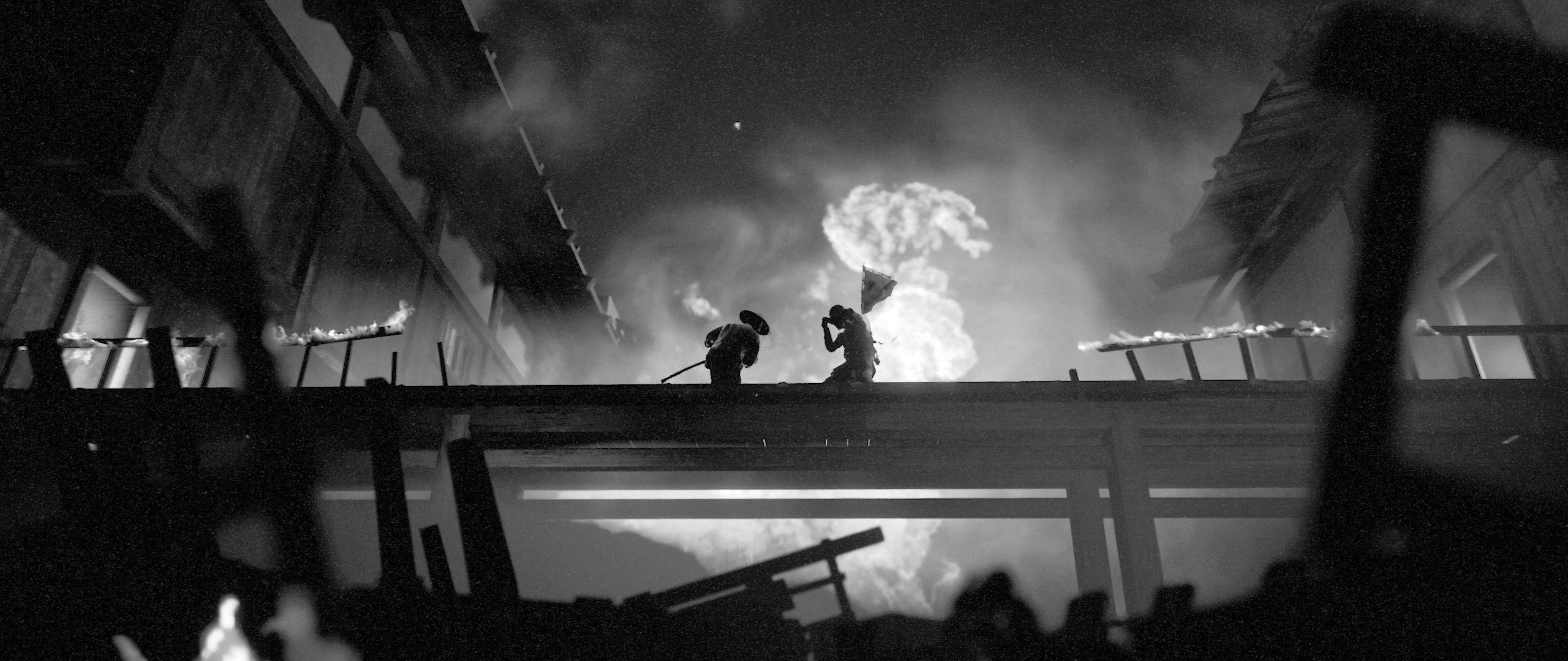 Flying Wild Hog ha optado por una predominancia de los planos en 2D, pero estos también se combinan con otros de disposición diagonal, y todo ello enmarcado en un bello mundo en blanco y negro que nos trasladará hacia el Japón feudal.