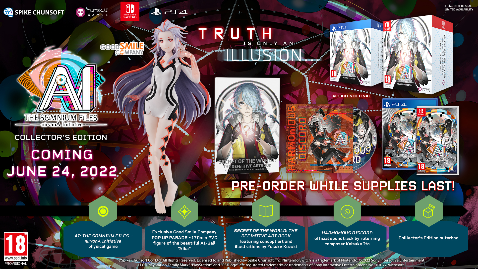 AI: THE SOMNIUM FILES – nirvanA Initiative llega en dos ediciones, una estándar y en una preciosa Collector´s Edition que hará las delicias de los fan de esta magnífica aventura. Esta edición incluye una copia de AI: The Somnium Files – nirvanA Initiative, una figura exclusiva de Good Smile de 17 CMs de ‘Aiba’, un libro de arte ‘SECRET OF THE WORLD: THE DEFIniTIVE ART BOOK’ y la banda sonora ‘HARMOniOUS DISCORD’.