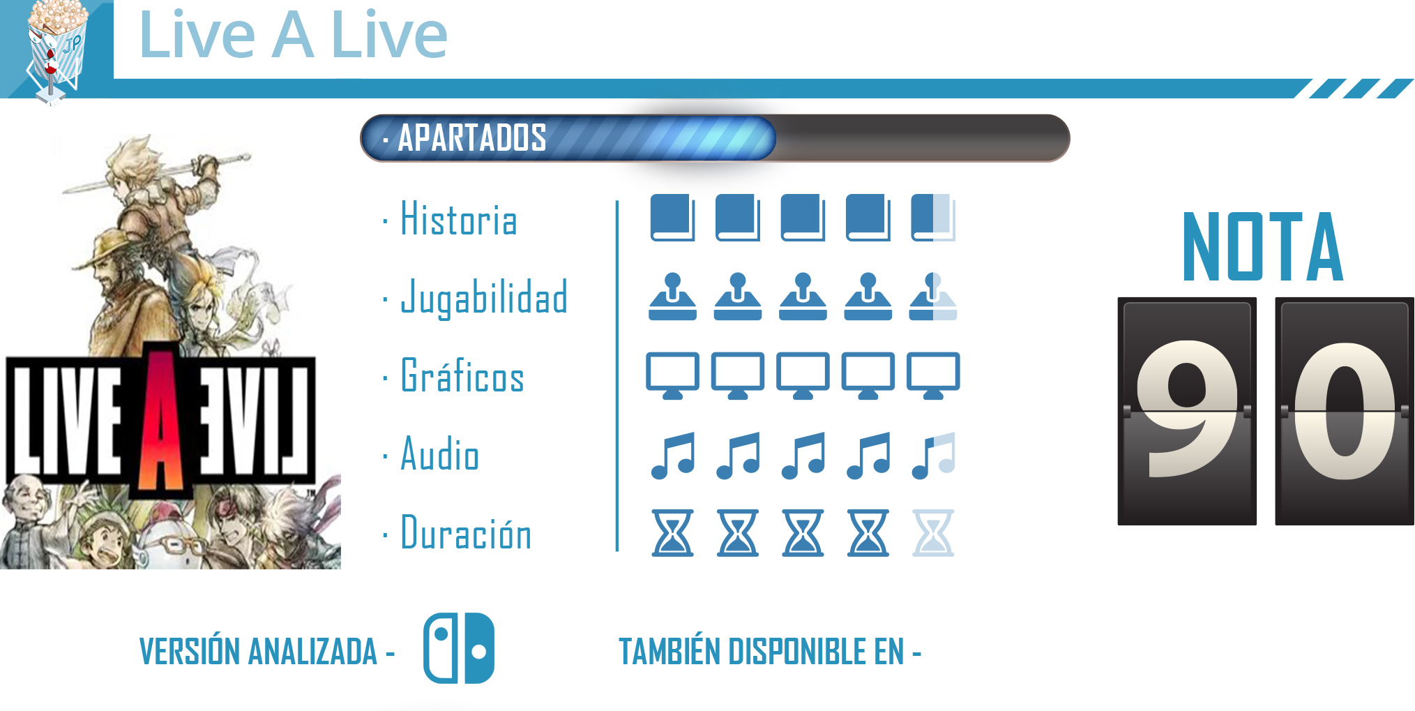 Live A Live es un título realmente original, un JPRG como los de antaño que a día de hoy se echan mucho de menos. Con este título Square Enix y Nintendo nos regala una joya que no todos conocíamos pero que, tras completarla, nos ha enamorado. Cada una de sus historias, el crecimiento de los personajes, su jugabilidad, estética y música, lo convierten en una verdadera obra de arte a la que merece la pena engancharse. Aunque, si bien es cierto que no todo su desarrollo está al mismo nivel, y que unas historias brillan más que otras, en general estamos ante un título imprescindible para los amantes de los JRPG de corte clásico.