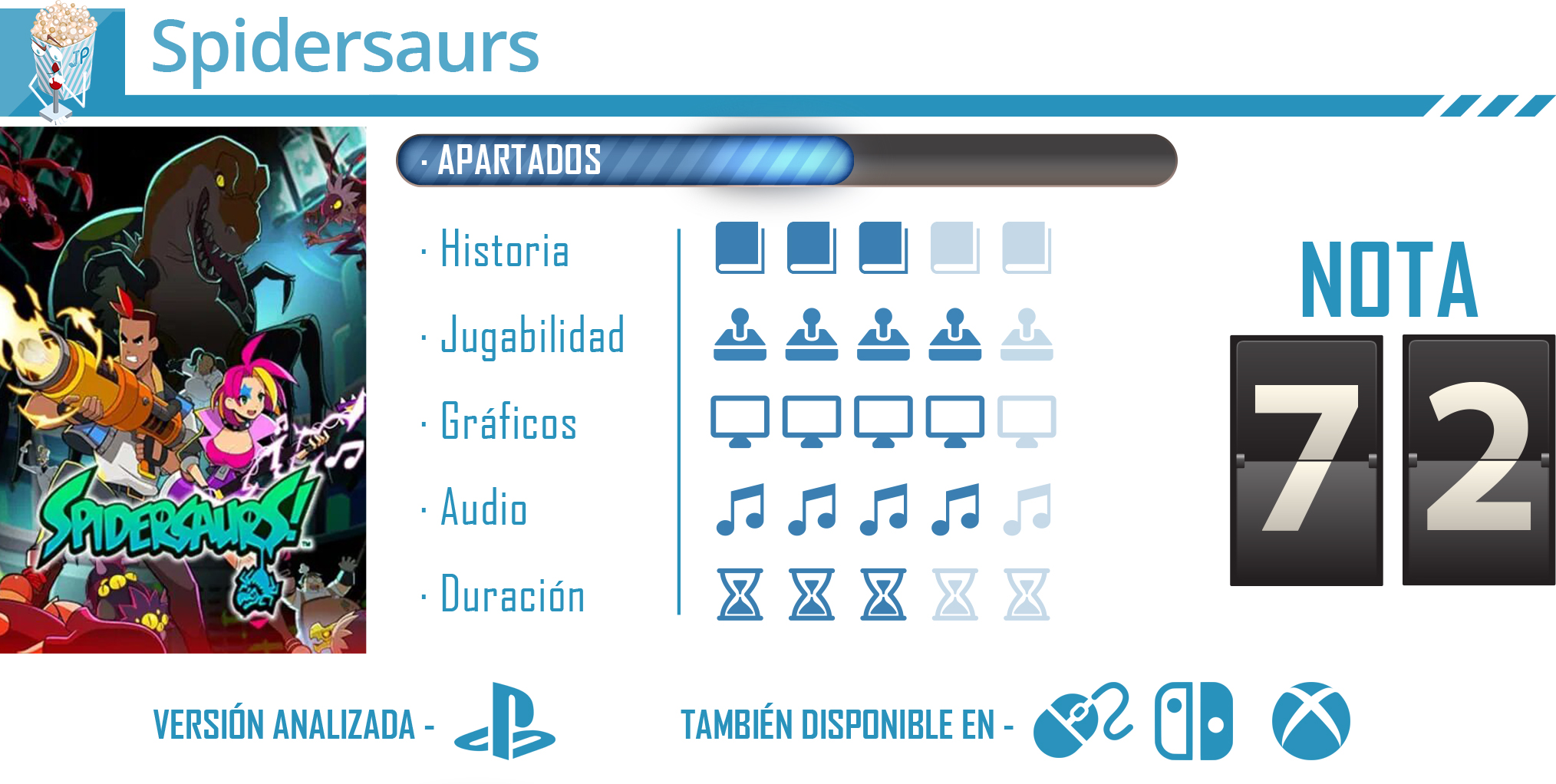 Spidersaurs es un título pensado para los jugadores más clásicos o que buscan un título sencillo y rápido sin demasiadas complicaciones. Es un juego que sabe homenajear a los clásicos run & gun como Contra, pero que tiene una personalidad muy definida y marcada, en parte dada por ese tono semi-humorístico y esa estética tan acertada y macarra que WayForward le ha sabido dar. Es una obra muy divertida y rejugable, aunque algo corta, pero que gana mucho en profundidad si lo jugamos con un amigo o familiar.