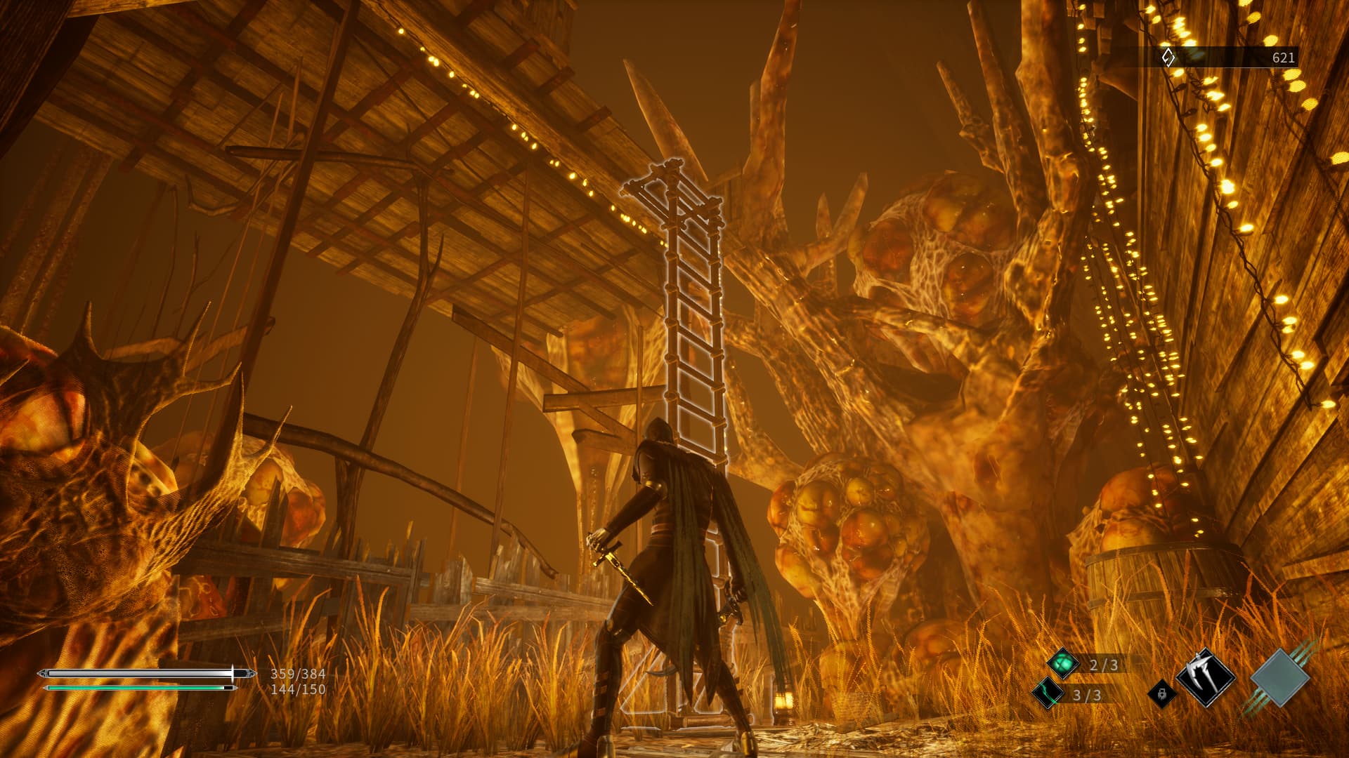 Y, hablando ya de lo técnico, hay que decir que el título cuenta con un acabado irregular. Las tres zonas que conforman el juego son lo bastante diferentes como para brillar por sí mismas y dar una gran variedad de entornos a la aventura. Pero, si nos fijamos bien, algunas de las texturas no están muy bien definidas y tardan algo en cargar. Las luces y las sombras juegan un papel fundamental en Thymesia y hay que alabar el gran trabajo que ha hecho el estudio en lo que respecta a la iluminación. Por su parte, también hay que nombrar que hemos sido testigos de algunas caídas de fps, aunque nada grave.