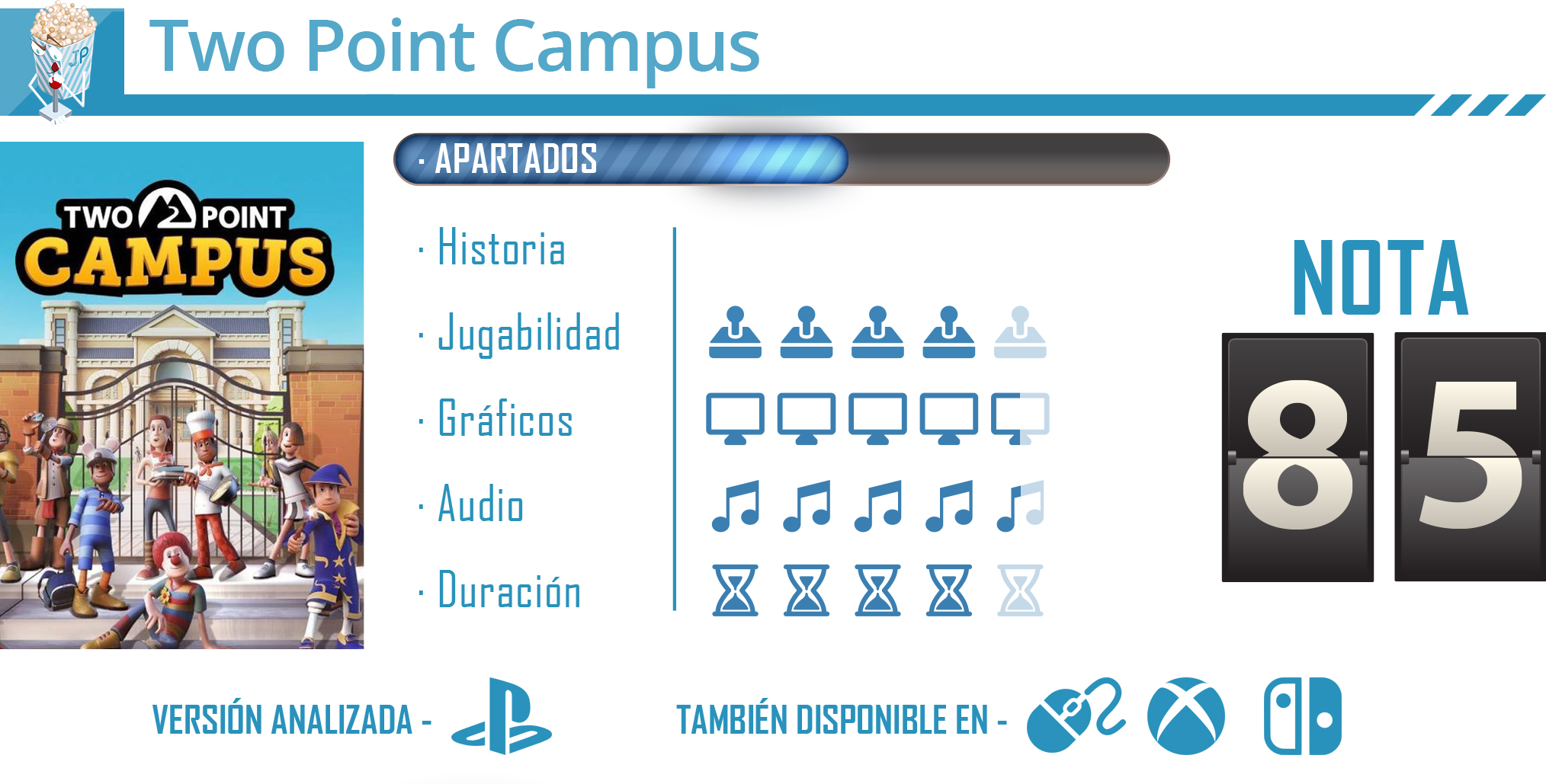 Two Point Campus es básicamente lo que esperábamos desde su anuncio, un cambio de aires con respecto a su predecesor en cuanto a temática, pero manteniendo su base jugable y sus señas de identidad como son su estética y su visión humorística de las cosas. Si te gusto Two Point Hospital sin duda te gustará esta segunda parte por así llamarla, eso sí teniendo en cuenta que sufre de las mismas fallas que sufría el primer juego del estudio.