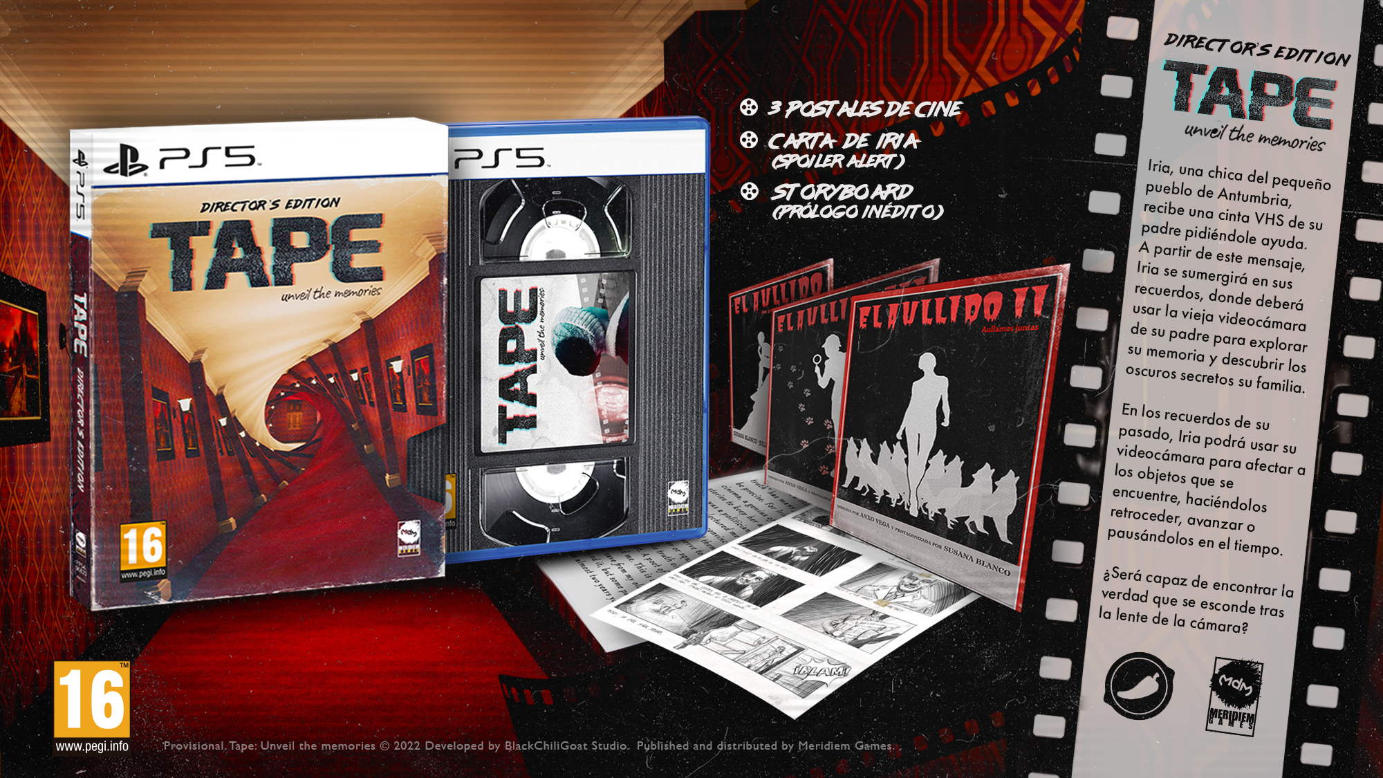 Meridiem Games es la encargada del diseño y fabricación de la edición de TAPE: Unveil The Memories, que estará a la venta en tiendas especializadas de toda Europa. La edición física Director´s Edition de TAPE: Unveil The Memories para PlayStation 5, incluye una funda especial, tres postales de las películas del director, la carta de Iria (cuidado, incluye spoiler) y el Storyboard del prólogo inédito.