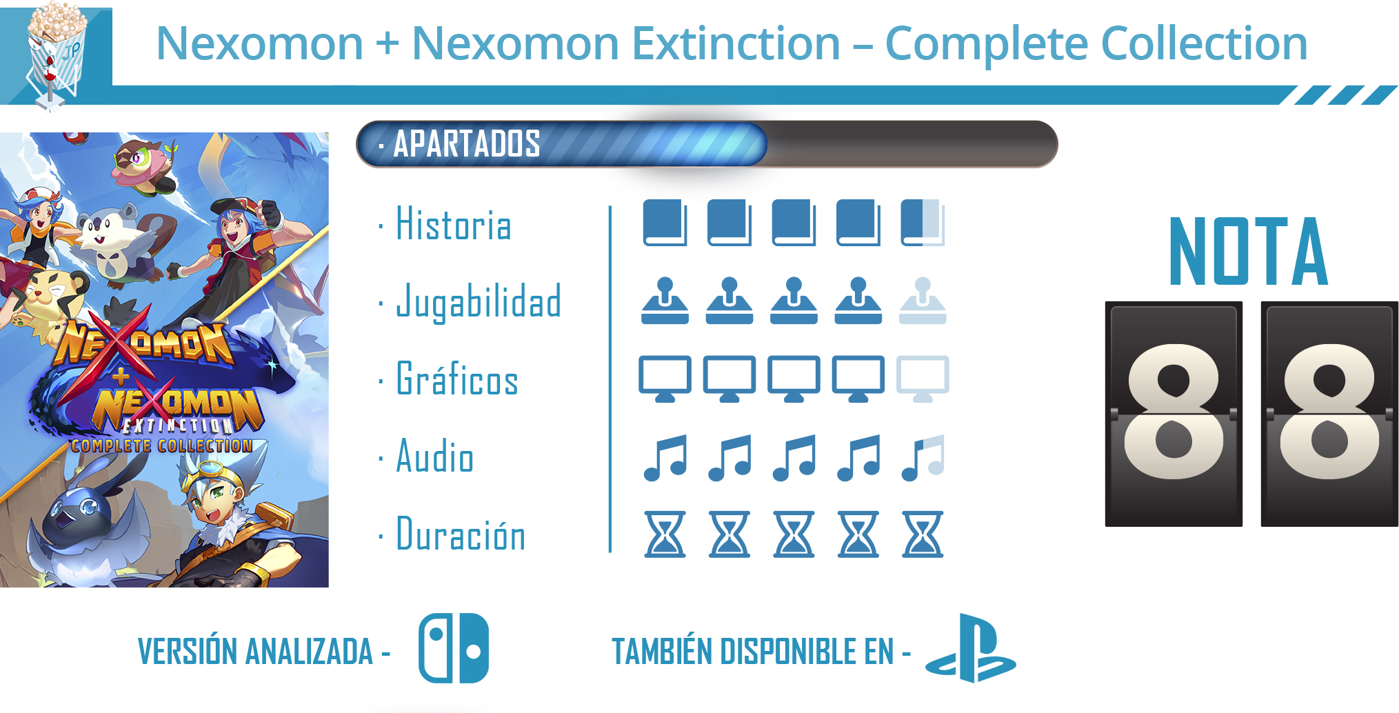 Nexomon + Nexomon Extinction – Complete Collectio es la perfecta oportunidad para que los aficionados a los RPG por turnos puedan disfrutar, y estamos seguros que se soprenderán. Tomando algunas bases jugables de la saga Pokémon, comola capturar monstruos, la forma de entrenarlos y hacerles evolucionar, lo que más lo diferencia es su interesante y más adulta historia. Todo esto anterior se complementa con una serie de mecánicas jugables bastante llamativas y cuyo resultado es el de un interesante juego muy recomendable para los que disfrutan de este tipo de aventuras y que sorprenderá a todos los que se acerquen a él.
