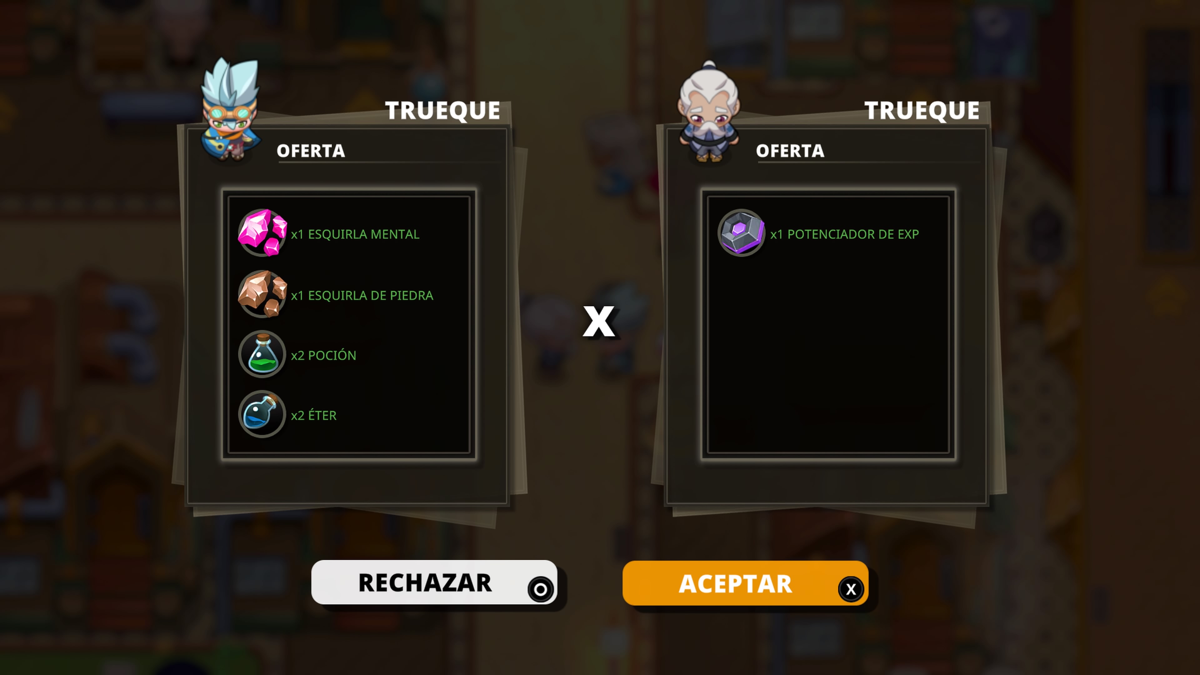 Fuera de los combates tenemos que hablar del desarrollo de la aventura. Una serie de misiones principales guiaran nuestros pasos, estas suelen marcarse con una estrella dorada encima de la cabeza de algún NPC, bastará con hablar con él o ella para que se active. Junto a estas también nos encontramos con otros personajes marcados de forma similar que nos pedirán realizar encargos de carácter secundarios, al realizarlas seremos recompensados con dinero o determinados objetos. Otra forma de interactuar con los habitantes de este mundo es a través de los intercambios; en algunos momentos observaremos a determinados personajes con una estrella azul sobre la cabeza que nos pedirán que les entreguemos algún Nexomon determinado o algunos objetos en particular a cambio de otros. Si bien esto último no es obligatorio, es recomendable en algunos momentos, siempre que nos interese el cambio.