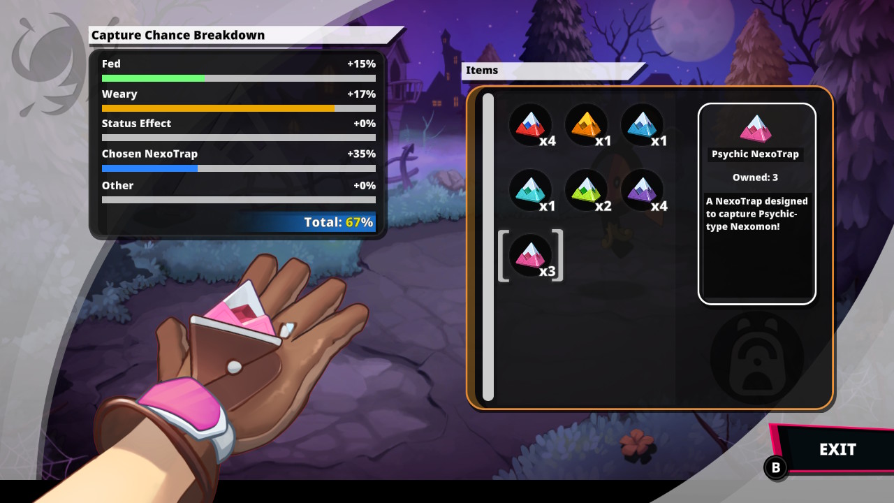 En ese sistema de captura es donde encontramos otras de las grandes diferencias con la franquicia Pokémon; aquí las NexoTrampas serán el objeto que usaremos para domar a estos seres, hay tantos tipos de NexoTrampas como elementos, más una de oro bastante efectiva que podremos conservar para aquellos Nexomon más únicos. Lo interesante de este sistema es que es más activo; no se trata solo de lanzar una trapa y esperar a tener suerte, sino que una vez que decidamos capturar a un monstruo salvaje dará comienzo una especie de minijuego basado en porcentajes que irá aumentando si utilizamos alguna comida sobre los Nexomon salvajes, y esta les gusta, así como también será importante que usemos una NexoTrampa del mismo tipo elemental que el Nexomon y otra serie de factores que entraran en curso como el estado aleteado que tengan o el cansancio.
