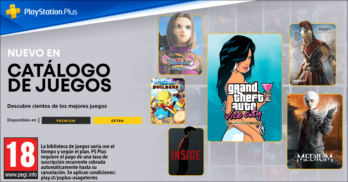 - PlayStation Plus Premium: Incluye todas las ventajas de los niveles anteriores, PlayStation Plus Essential y PlayStation Plus Extra, y además añade pruebas de juego por tiempo limitado, un catálogo de clásicos de hasta 340 juegos de previas generaciones de PlayStation y retransmisión en la nube de una amplia variedad de contenidos. El usuario puede suscribirse a esta experiencia de juego completa por solo 16,99€ al mes, 49,99€ por tres meses o 119,99€ el año (suscripción anual equivalente a 9,99€ al mes).