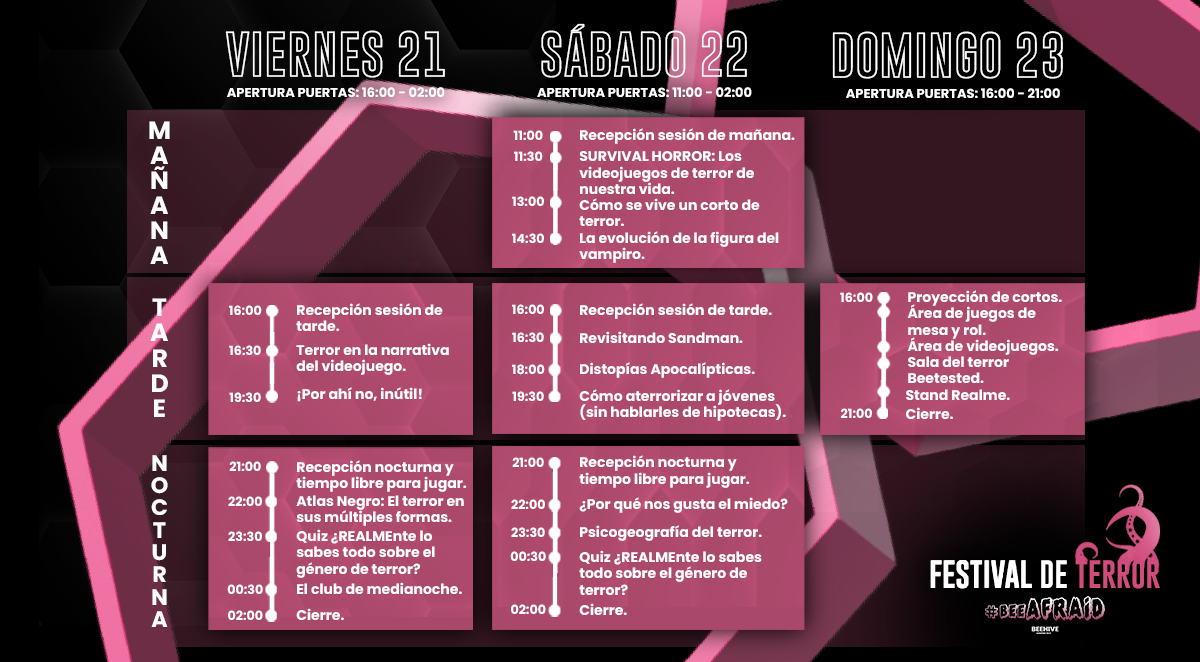 Del 21 al 23 de octubre Madrid se viste de Halloween con la primera edición del festival de terror #BeeAfraid en Beehive Gaming Box. El festival reúne gran variedad de perfiles del sector de los videojuegos, la animación, la literatura y otras áreas del arte.