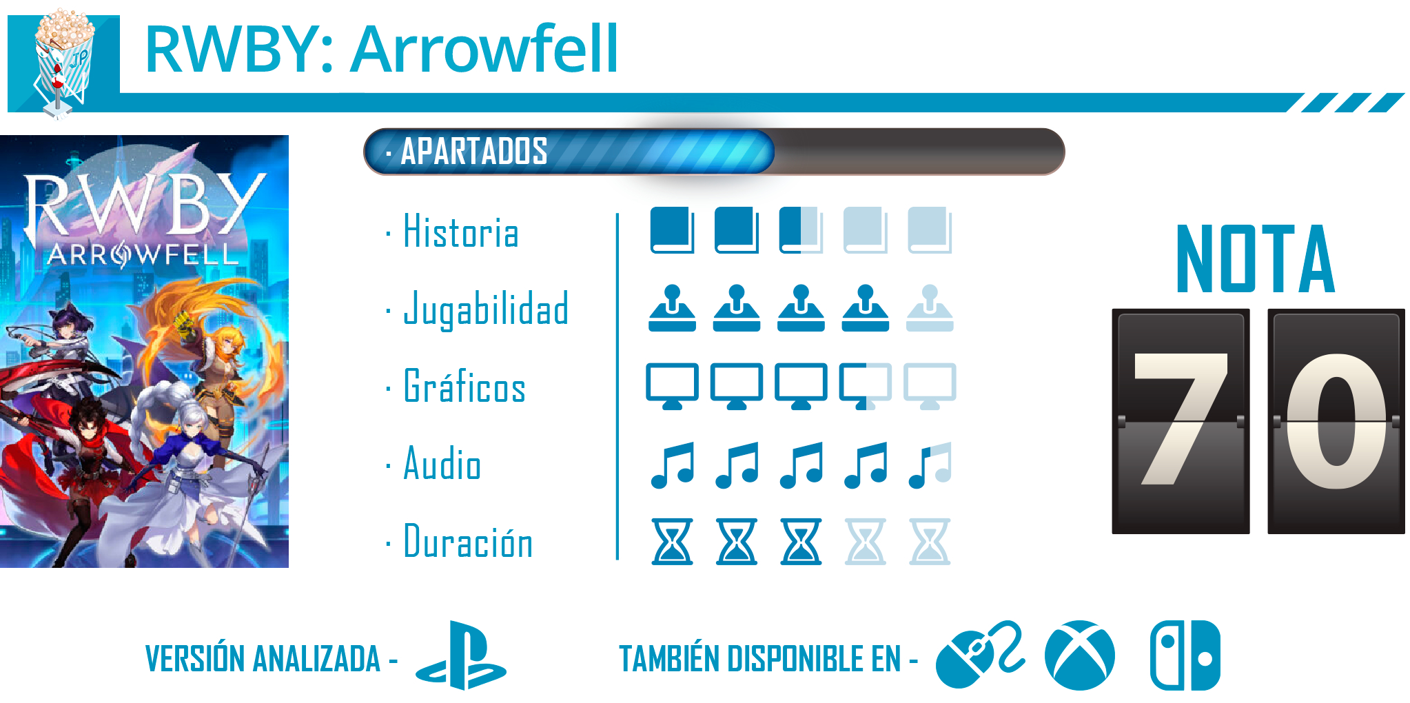 RWBY: Arrowfell es un título de acción y plataformas en 2D muy tradicional y clásico, con todo lo que acarrea. No innova demasiado en el género y su mayor fuerte es esa posibilidad de alternar el control de las cuatro protagonistas y sus habilidades únicas. No obstante, hemos de decir que tiene un desarrollo rápido, dinámico y desenfadado, y resulta bastante adictivo, sobre todo para los fans de la serie. Sin duda es un título que sabe a qué público va dirigido y lo explota, consiguiendo que sea un producto muy recomendado para los seguidores de RWBY.
