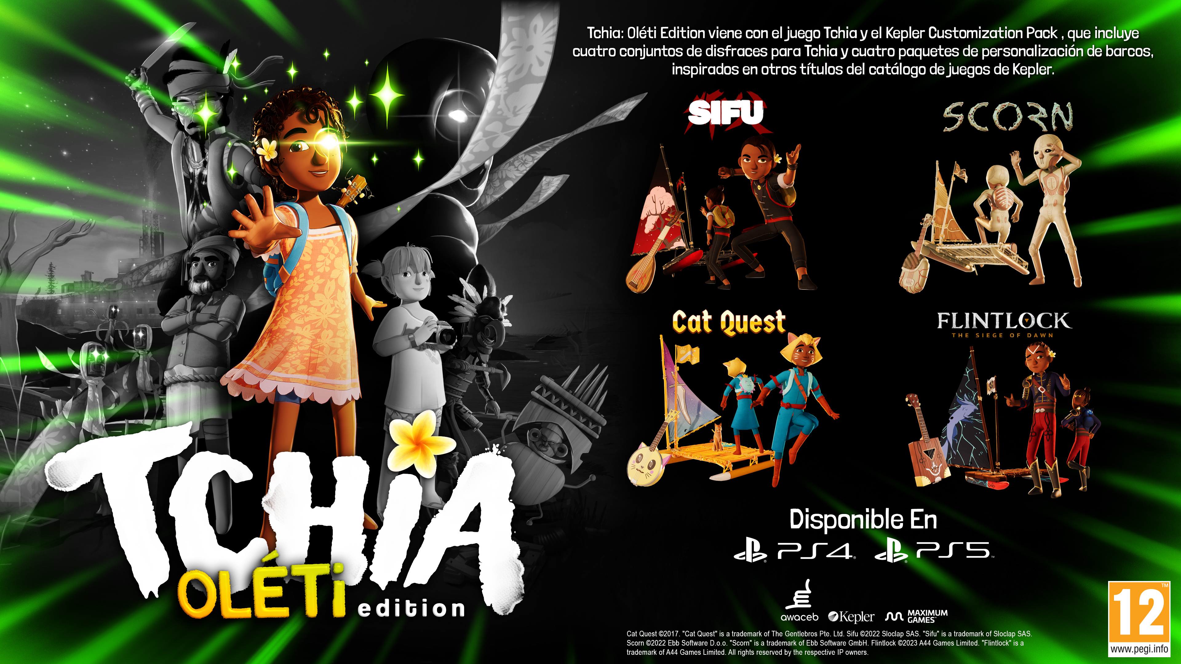 La edición física Oléti incluye un pack de cosméticos inspirado en la familia de juegos de Kepler Interactive, entre los que se incluyen Sifu, Scorn, Flintlock: The Siege of Dawn y diseños inspirados en Cat Quest. Personaliza con objetos y aspectos tu barco, el ukelele, el planeador e incluso el atuendo de Tchia.