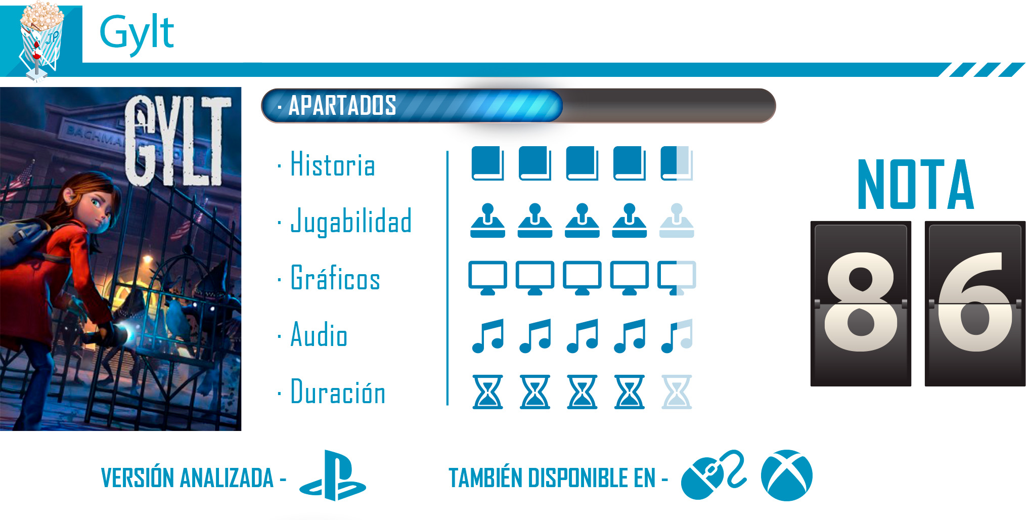 Con esa suma de elementos clásico de survival horror. Gylt brilla en cada una de sus partes y se convierte en una aventura ideal para todos aquellos que sean fans de este tipo de juego. Su temática oscura, su ambientación y sus personajes se convierte en una de sus mayores bazas, dando como resultado una aventura que ahonda en los miedos más profundos de los niños y que se proyecta hacia los jugadores, materializando a través de criaturas tan reales como aterradoras.