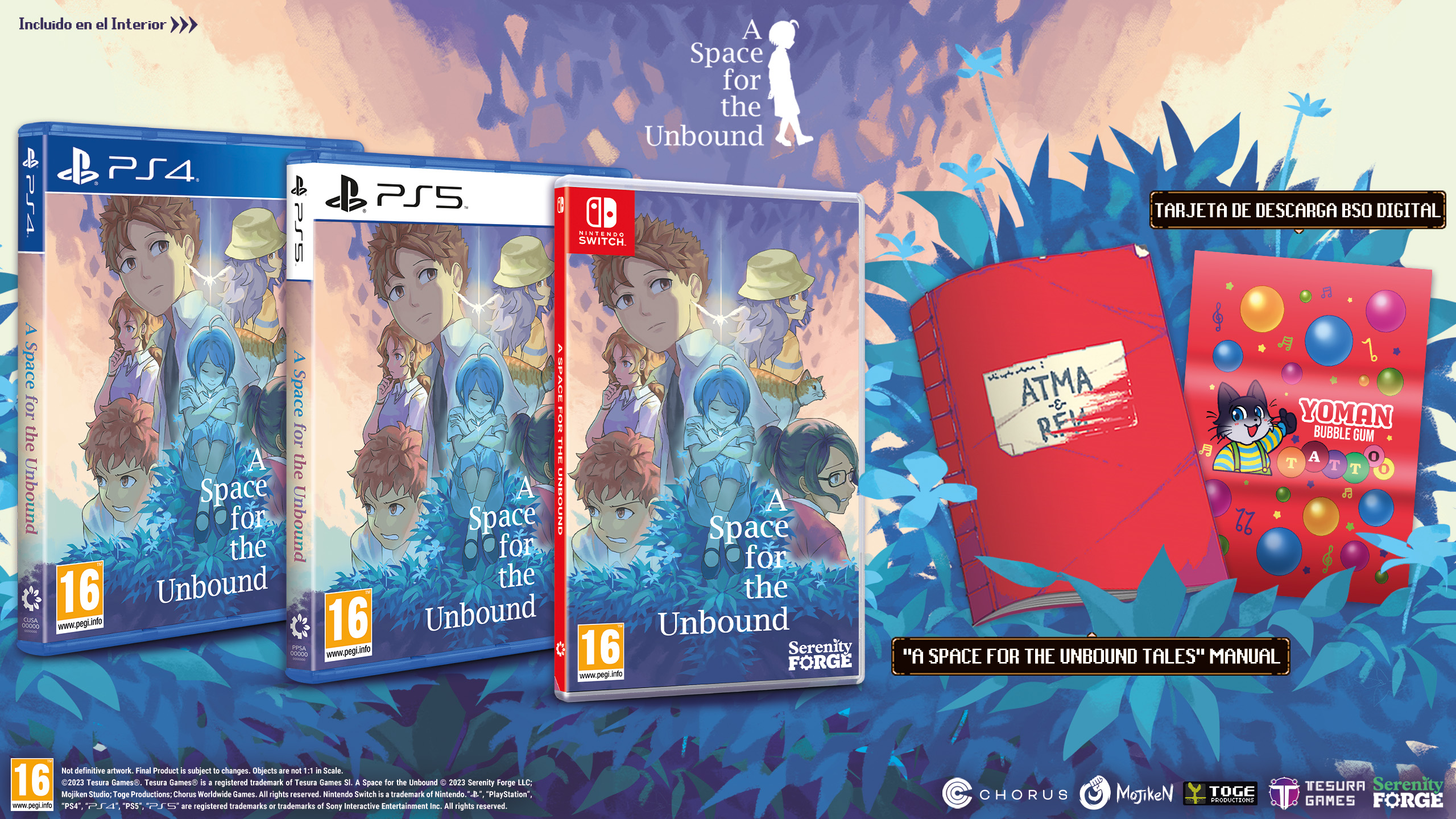 A Space for the Unbound se lanzará en formato físico en Edición Normal y Especial para PlayStation 4, PlayStation 5 y Nintendo Switch en el Q1 2024. Las reservas ya están disponibles en las principales tiendas de videojuegos, Amazon y la Tesura Store.