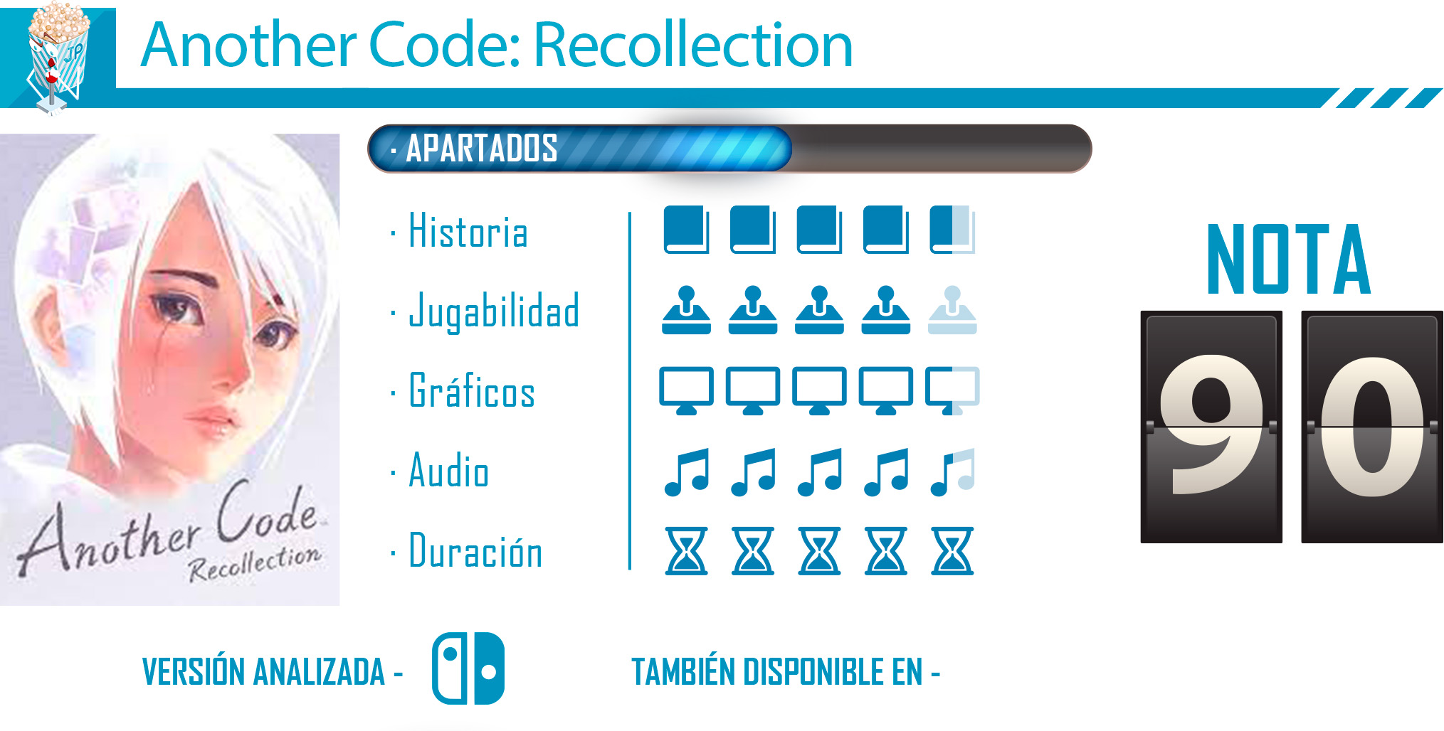 Another Code: Recollection es una compra prácticamente obligada para aquellos jugadores que disfruten de los misterios y de las visual novel con toques de exploración. Cing nos dejó un vacío a todos cuando desapareció pues sus juegos eran únicos y muy especiales, repletos de emociones y sentimientos. Con esta nueva versión de las aventuras de Ashley tenemos la oportunamente de volver a disfrutar de el viaje de esa joven por un mundo repleto de puzles muy imaginativos y de historias perro descubrir, pero todo ello elevado a una potencia que no nos imaginamos gracias a su estupendo apartado visual y sonoro. Con este trabajo en marcha, solo podemos soñar que Nintendo vuelva con el estupendo y carismático Kyle Hyle, para poder disfrutar nuevamente de su aventura en el Hotel Dusk.