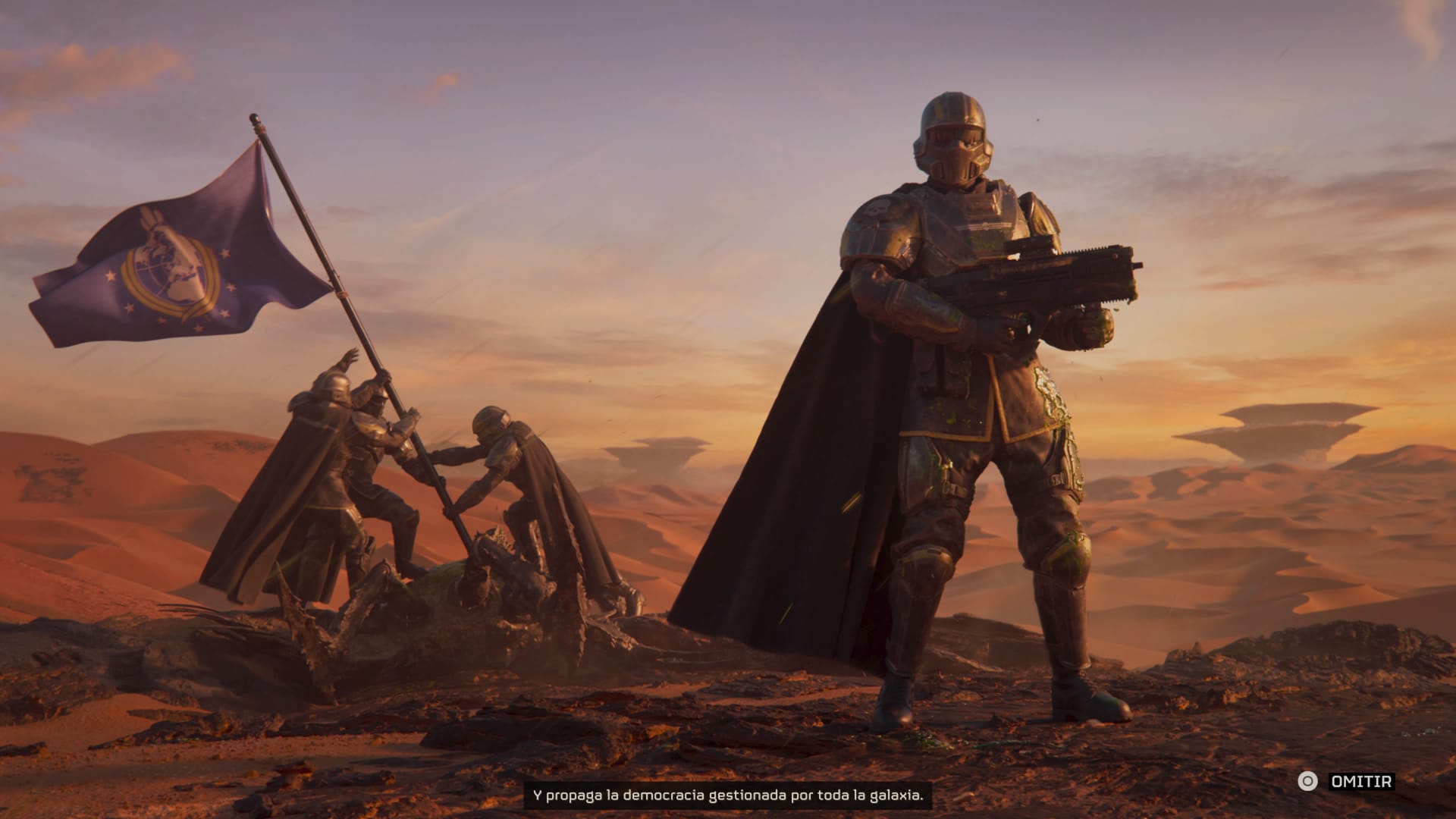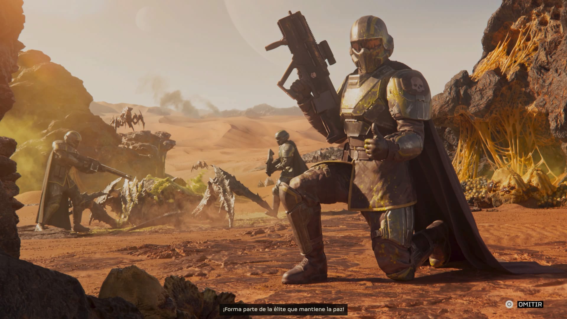 Entonces, lo que nos ofrece Helldivers II para ponernos en contexto es un mundo distópico, donde los humanos se han expandido en el universo y luchan por llevar la libertad y la democracia por la galaxia, y sí, la democracia es una palabra que usaremos mucho en el juego.