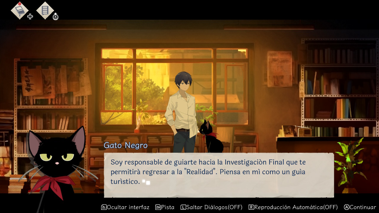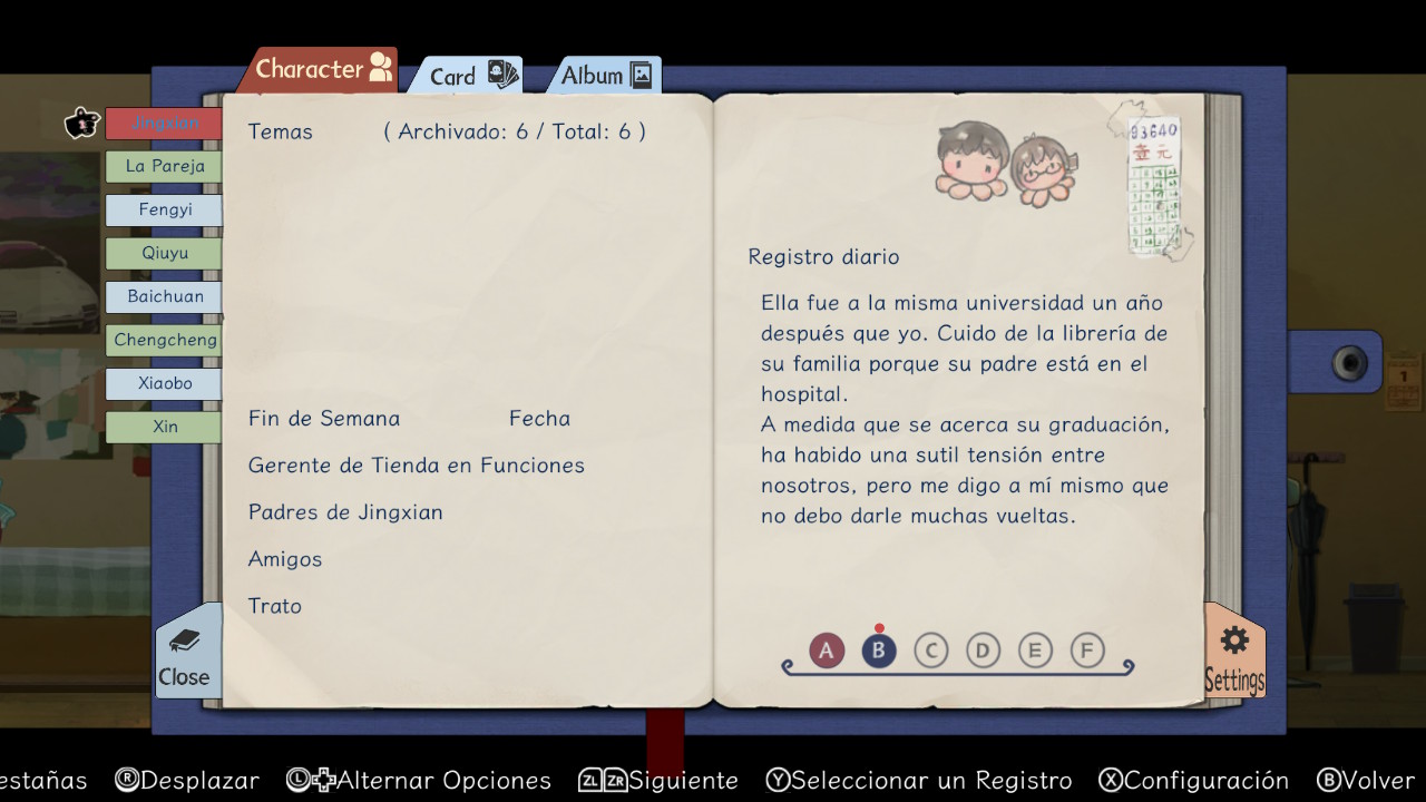 En un diario tendremos toda la información de todos los personajes con los que tiene contacto el protagonista, incluyendo a él mismo. En la parte izquierda aparecerán una serie de palabras clave, que recogerán información relacionada con esa palabra o palabras. Mientras, en la página derecha, tendremos un registro que se irá completando conforme vayamos avanzando en la historia y vayamos interactuando con el resto de personajes. Y como extra aquí es donde se almacenarán las tarjetas coleccionables que podemos encontrar en varios escenarios del juego y las imágenes a modo de fotografías de momentos importantes en la historia.