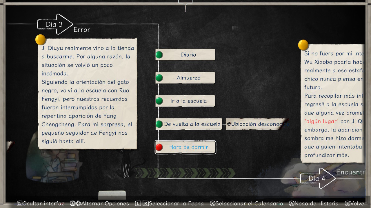En caso de que fallemos, queramos volver a un punto de la historia o bien queramos ver un resumen de los días, podremos acceder a este diagrama que va marcando los eventos de cada día. En total el juego está constituido por 12 días de investigación y cuenta con una duración aproximada de 5 horas.