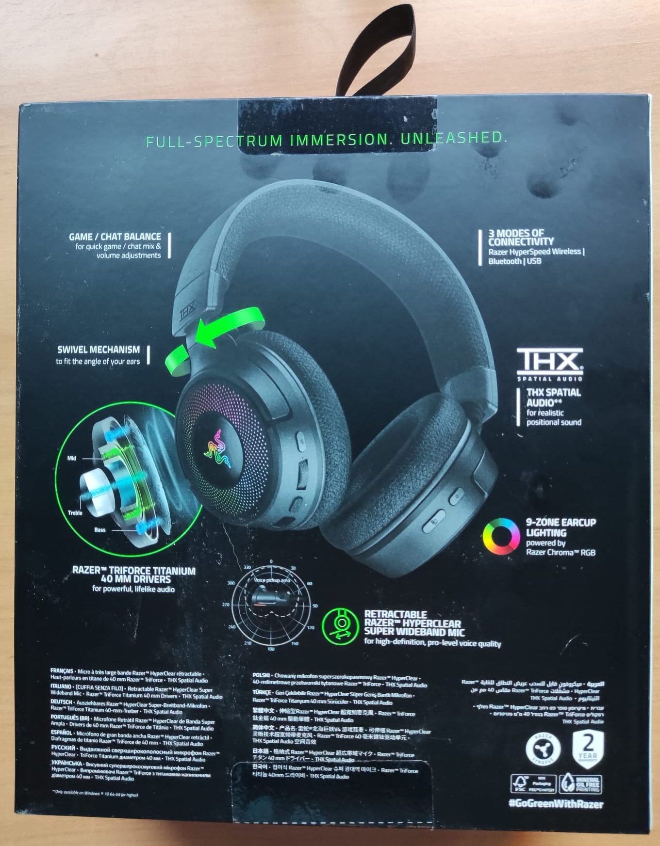 En la parte trasera vemos de nuevo una imagen a gran tamaño del periférico y nuevas indicaciones que inciden más sobre las prestaciones de los Kraken V4. Entre ellas se destacan sus mecanismos de giro ajustable, tres modos diferentes de conectividad, el sistema de audio THX Spatial para conseguir un sonido posicional más realista, o que cuenta con 9 zonas de iluminación RGB.