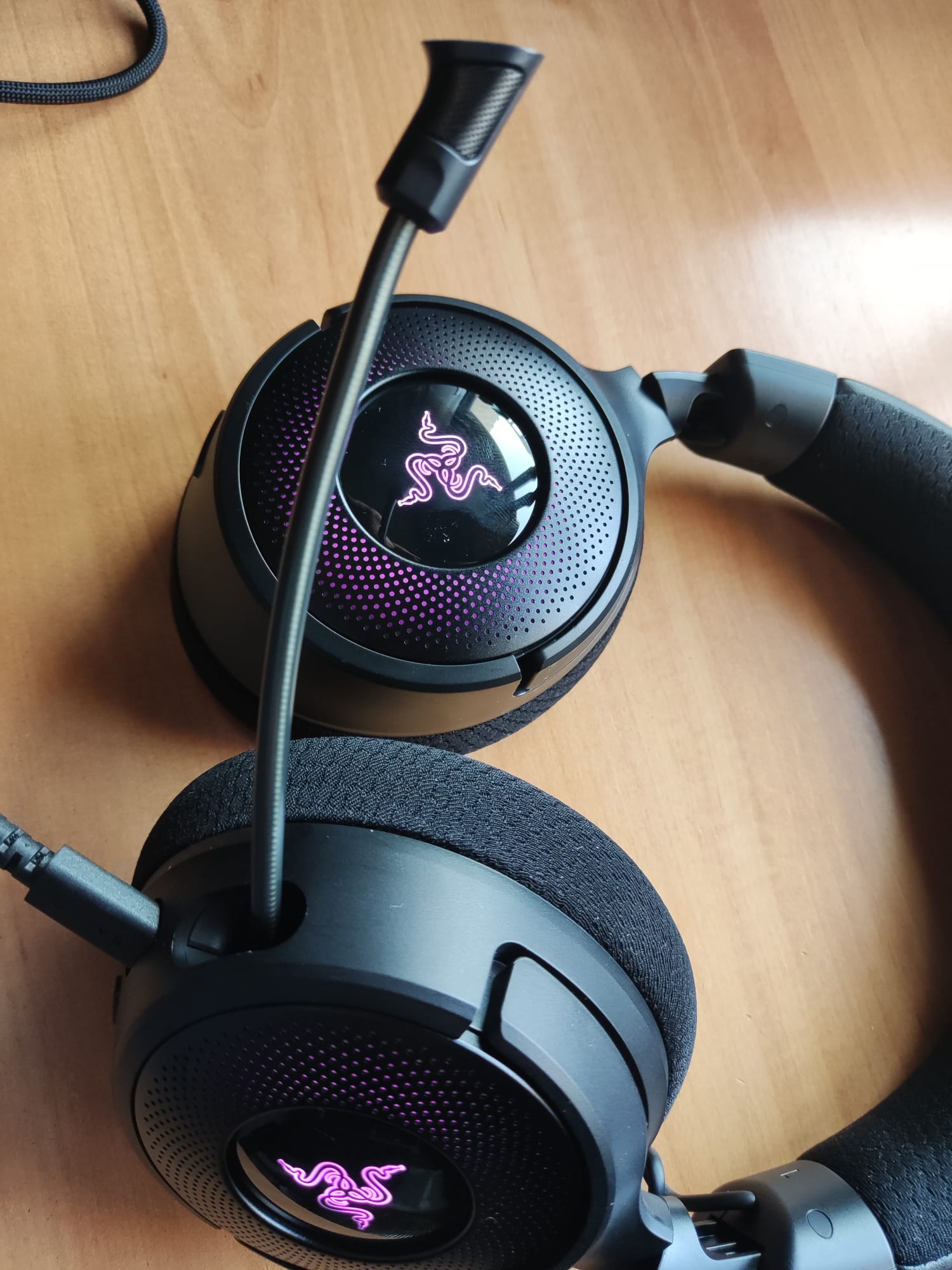 Esto nos lleva a hablar de la conectividad, y de las diferentes formas que tendremos que conectar los Kraken V4 con los dispositivos que son compatibles. Como hemos adelantado en el apartado del unboxing, este headset incluye una serie de cables y dispositivos de conexión, como son ese Razer HyperSpeed Wireless Dongle USB-C, con el que podremos realizar conexiones inalámbricas con los despóticos compatibles; un cable USB-A a USB-C de unos dos metros, con el que podemos conectar los cascos vía USB; y un adaptador USB-C a USB-A.