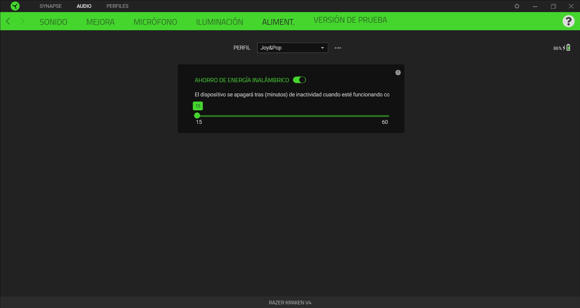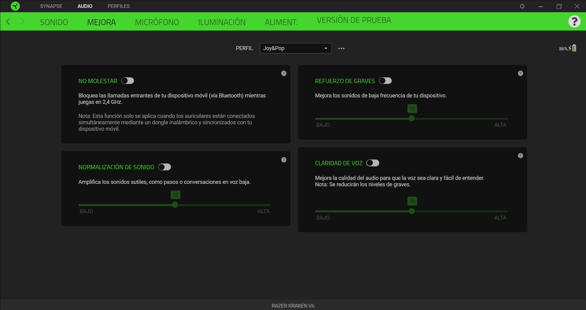 Y hablando del Razer Synapse, esa aplicación de configuración que se puede descargar de forma gratuita desde la página de la compañía, hemos de señalar que con estos Kraken V4 se nos muestra diferentes opciones de configuración, tanto del sonido, como del micrófono o de su iluminación.