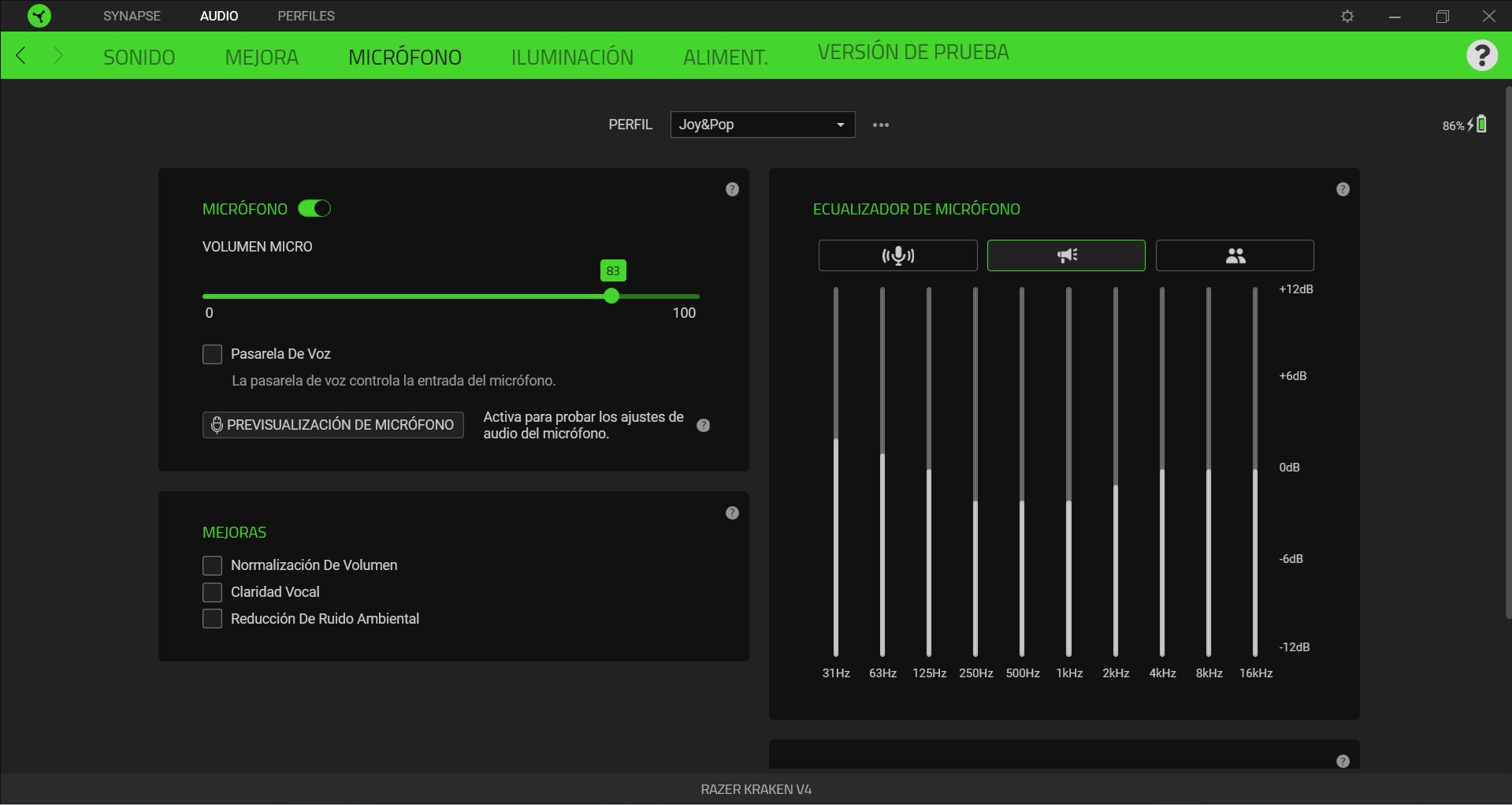 La tercera pestaña estará dedicada a la configuración del MICRÓFONO. Desde aquí también podremos realizar diferentes opciones, como subir y bajar el volumen, aplicar mejoras para el volumen y equalificar el micrófono, asignándole a diferentes perfiles.