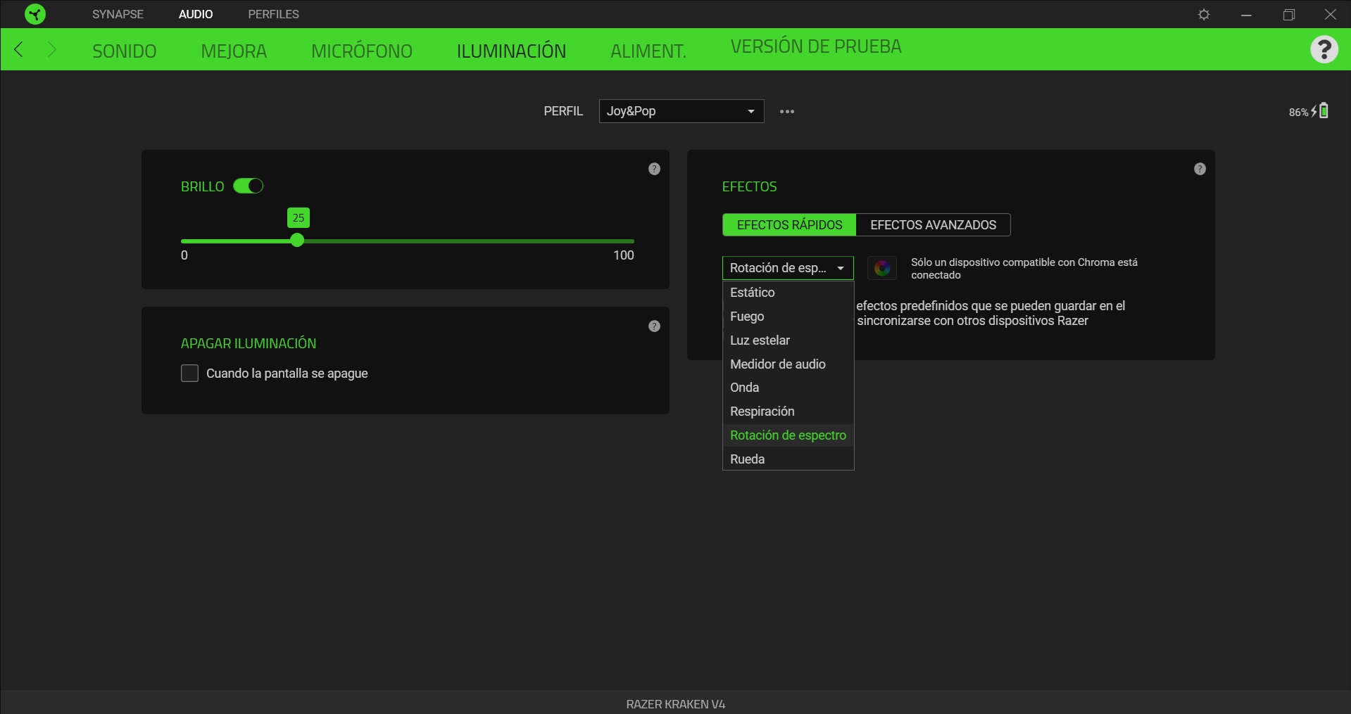 En cuarto lugar, tenemos la ILUMINACIÓN. Como hemos dicho, los Kraken V4 cuenta con iluminación de tecnología Chroma RGB, y desde el Synapse se puede realizar una configuración en base a diferentes patrones predefinidos, también podemos crear el nuestro propio a través de Chroma Studio o realizar otras modificaciones, como ajustar la intensidad.