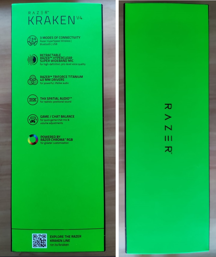 Empezando por la característica imagen de Razer, toda la caja se presenta en sus logotipitos colores verde y negro. En la parte frontal, y como es común en la marca Razer, lo primero que se nos presenta es una gran imagen del producto, en este caso los Kraken V4, así como una serie de indicaciones, entre las que se destacan su forma de conectividad, que incluye la tecnología Razer Chroma RGB, que su micrófono es retráctil e incluye la tecnología Hyperclear, también cuenta con el Razer Triforce Titanium y que se apoya en la tecnología THX SpatIial. Igualmente, en la parte más inferior, se nos indica que estos cascos son compatibles con PC, AC, PlayStation, Nintendo Switch, Steam Deck y Smartphone.