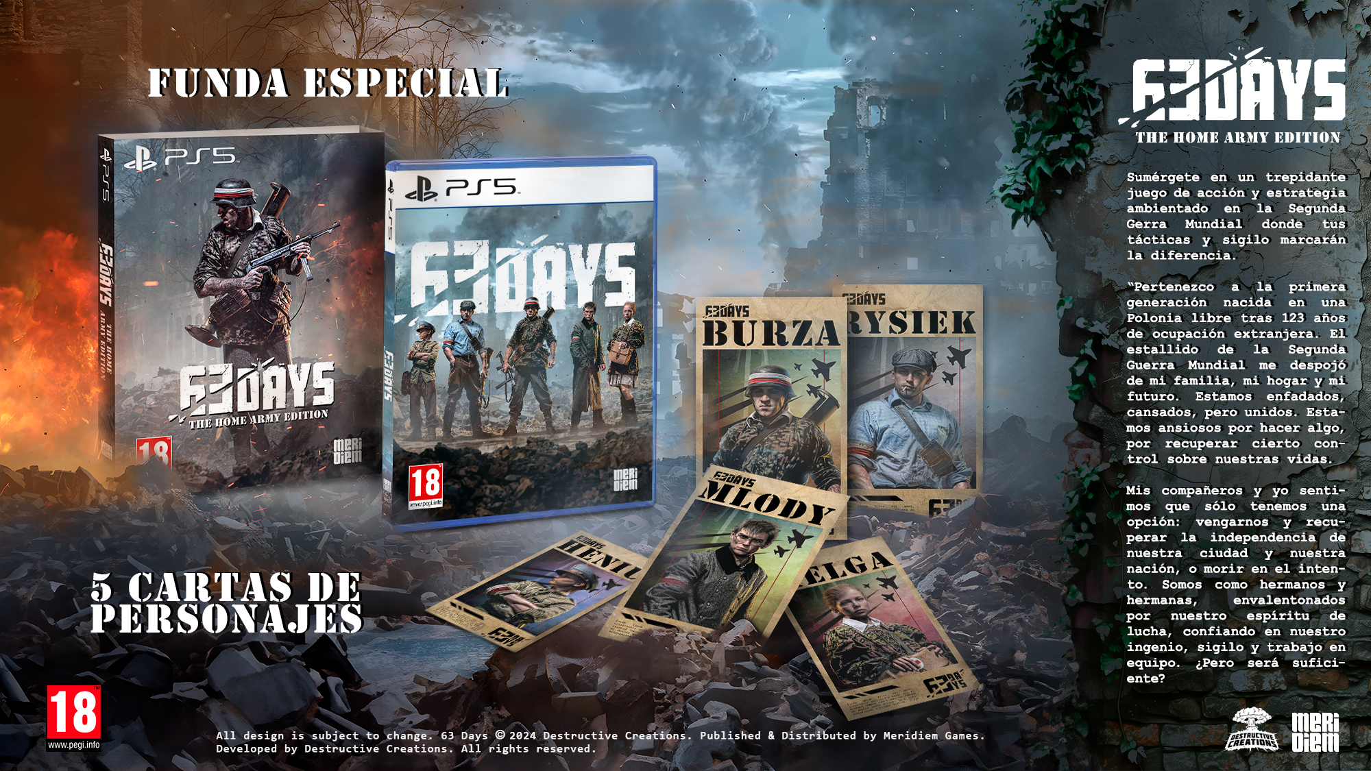 Meridiem ha sido responsable del diseño y la fabricación de esta edición física, que estará disponible en tiendas. La edición física The Home Army Edition de 63 Days para PlayStation 5 incluye una funda especial de coleccionista y un exclusivo set de cinco cartas con ilustraciones de los personajes principales de esta aventura histórica.