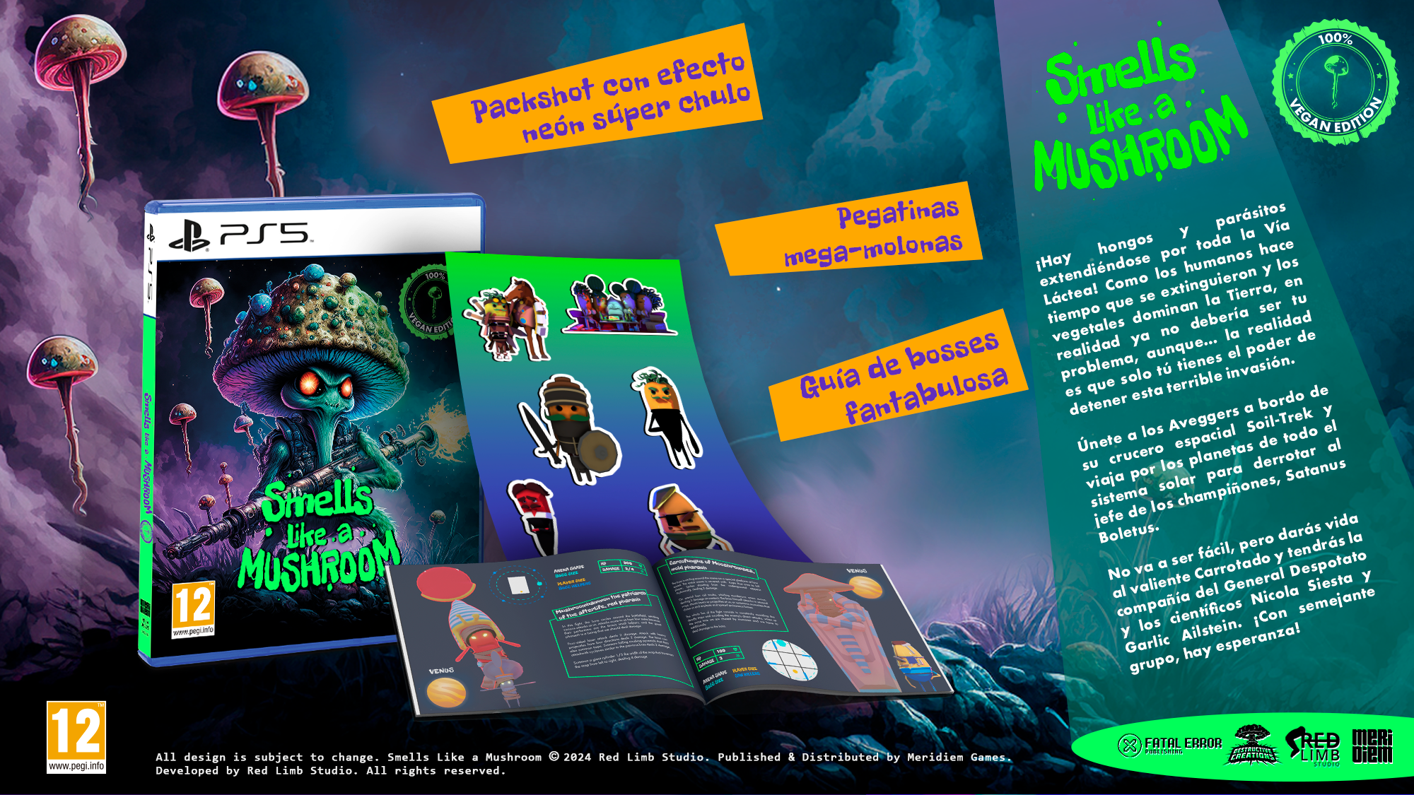 Meridiem ha sido responsable del diseño y la fabricación de esta edición física, que estará disponible en tiendas. La edición física 100% Vegan Edition de Smells like a Mushroom para PlayStation 5 incluye un packshot con efecto neón súper chulo, un exclusivo set de pegatinas mega-molonas y una Guía de Bosses, diseñada especialmente para prepararte ante todos los desafíos que te enfrentarás en esta aventura vegana.