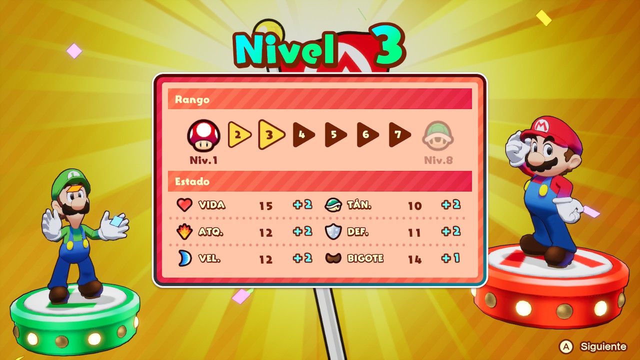 Por último, tenemos que hablar de la progresión. Mario y Luigi suben de nivel a medida que hagan experiencia. Cuando llegamos a un cierto nivel, se nos da la posibilidad de desbloquear un logro concreto, como puede ser tener un punto más de ataque, defensa, velocidad o vida en cada subida de nivel o poder tener un hueco más para poder equiparnos accesorios. Sin olvidar todo el equipo que podemos comprar, encontrar o incluso crear durante el juego para poder mejorar aún más los atributos.