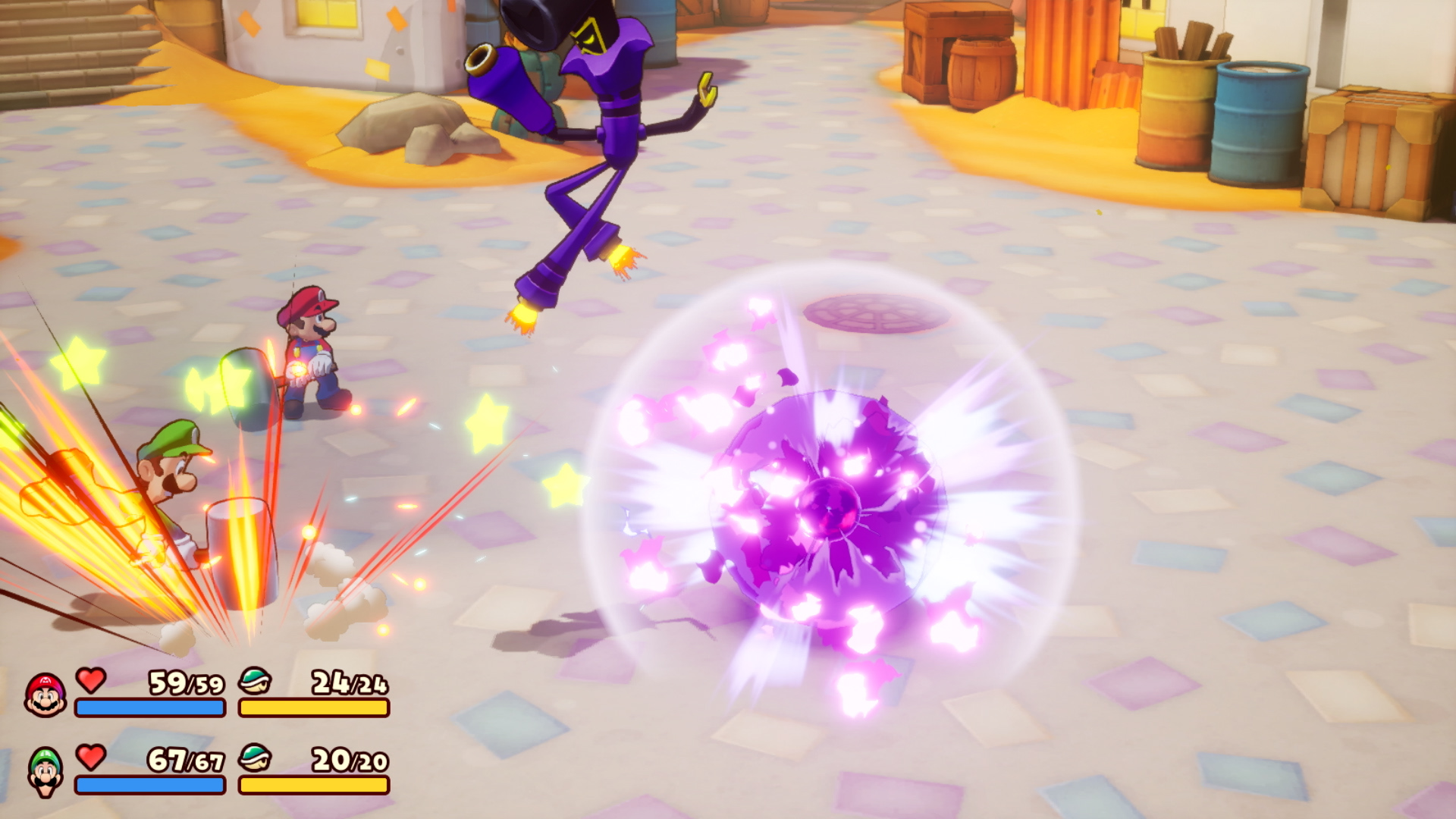 La mecánica de esquive es bastante importante. Si realizamos la combinación correcta de botones o pulsamos en el momento adecuado podremos esquivar ataques enemigos o incluso contraatacarlos. Durante los combates contra los jefes de zona podemos hacer uso del escenario, en determinados momentos Luigi tendrá una idea y podrá usar objetos del escenario para realizar un ataque directo potente si interactúa de manera correcta con los objetos. Todo esto hace que el combate sea muy dinámico en cada momento y no se base sólo en dar al botón atacar o defender.