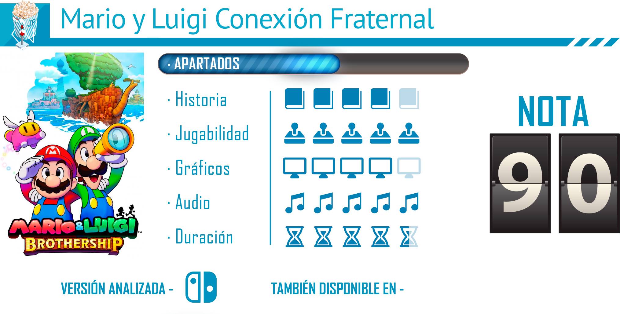Hemos disfrutado, y aún lo hacemos, de esta nueva entrega de Mario y Luigi en Nintendo Switch. Nos encontramos posiblemente ante uno de los imprescindibles del catálogo para las personas que les gustan los juegos RPG y sobre todo a los amantes de los fontaneros del reino champiñón. Un juego relajante, amigable y muy divertido tanto en su jugabilidad como en personajes y diálogos. Tenemos una gran mezcla de mecánicas, desde combates, puzles y secciones aventura, todo ello planteado de una manera ligera que hace que sea disfrutable para todo tipo de públicos. Sin duda, es una alegría que Nintendo siga confiando en estos proyectos que quizás no sean tan populares como son las entregas típicas, pero que sin duda añaden catálogo y hace que los amantes de otros géneros de juego puedan seguir ligados a las franquicias de Nintendo.