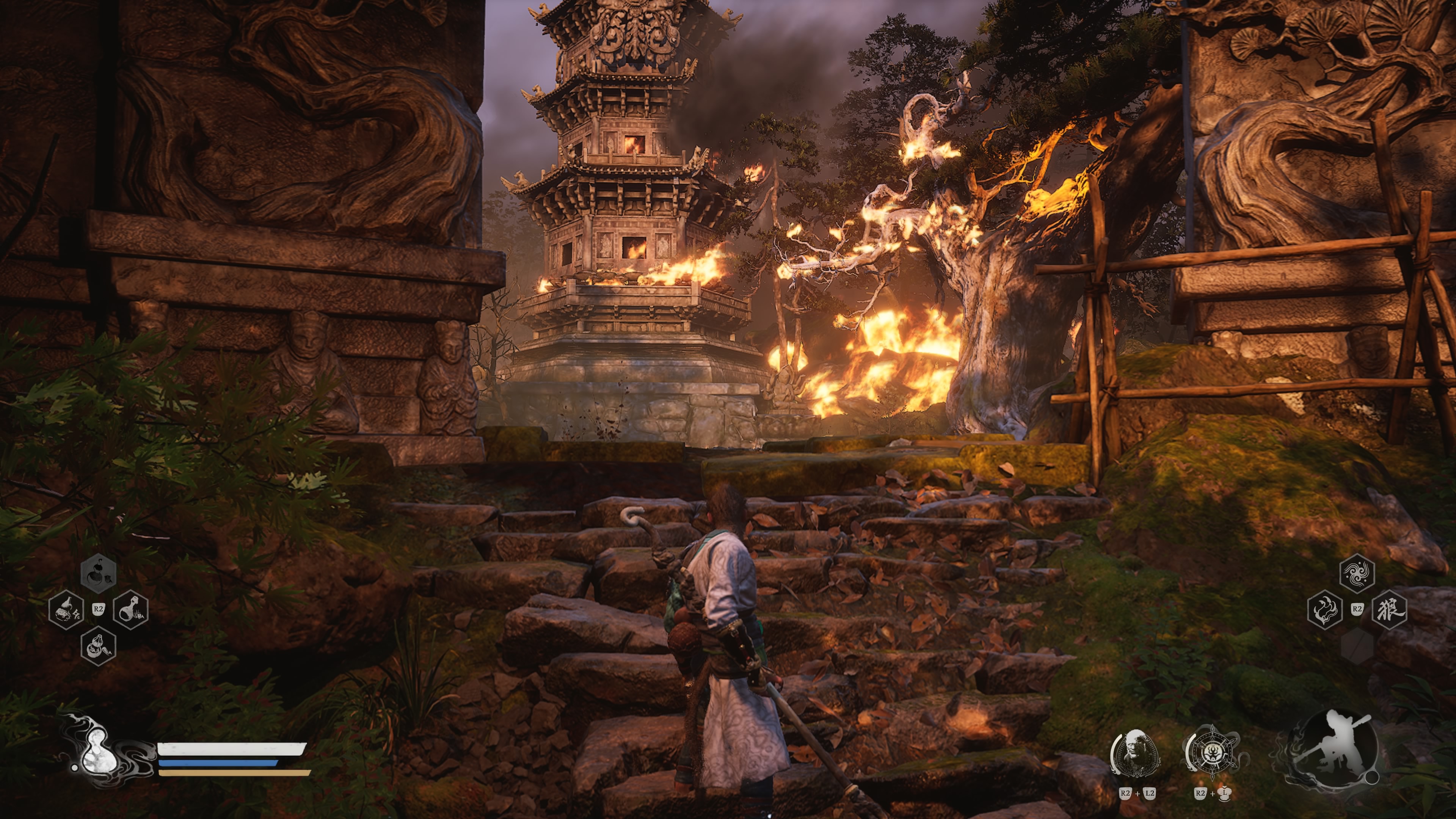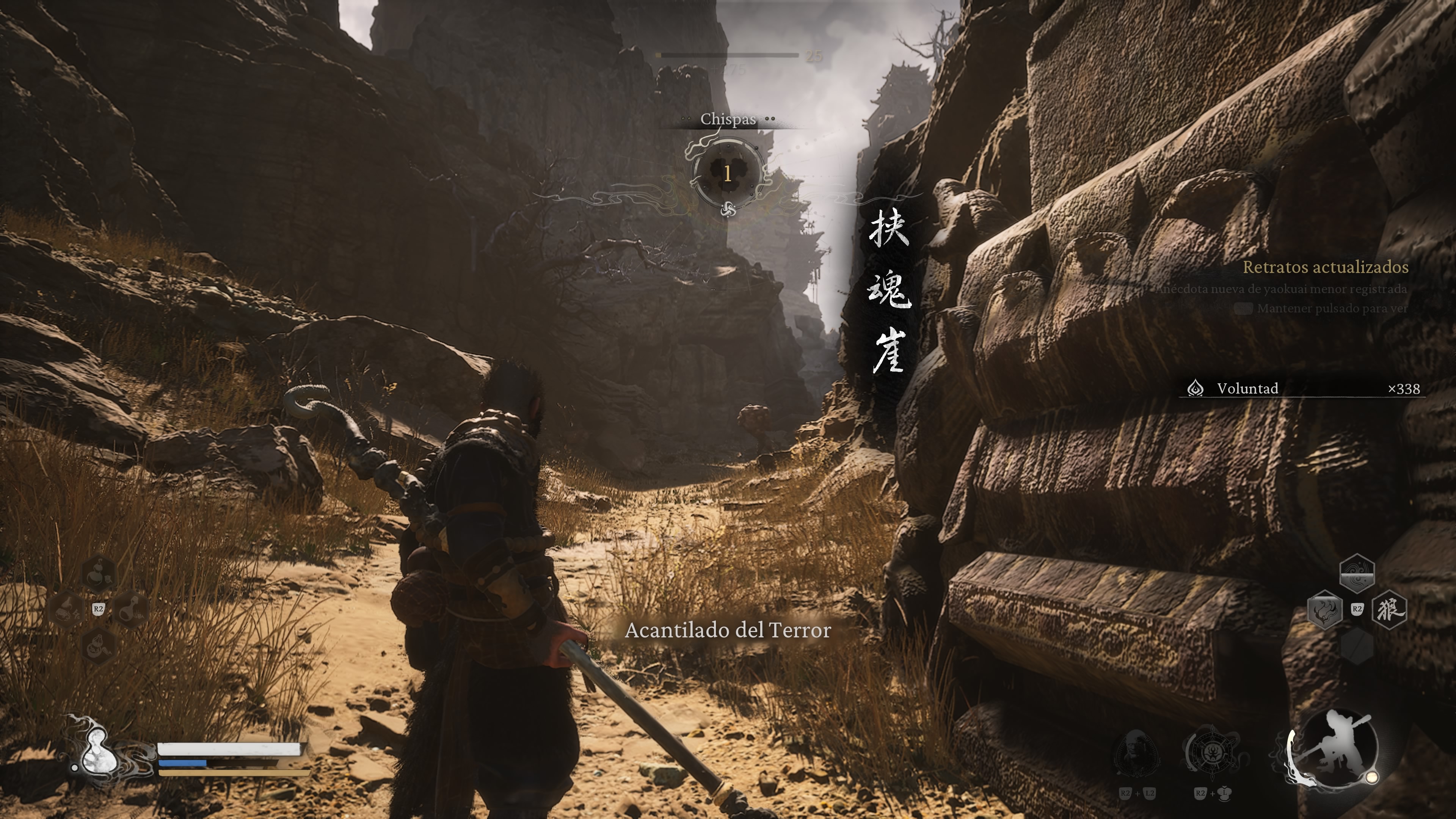 Una de las cosas que se especulaba antes de la salida de Black Myth era que iba a ser otro juego tipo Soulslike, pero una vez que empezamos a jugar y sentimos el control en las manos podemos decir que está alejado de la saga de FromSoftware. Para empezar, no tenemos la opción de hacer parry a los enemigos, si bien es verdad que tenemos una habilidad que nos permite convertirnos en piedra durante un instante y ser capaces de repeler ataques, no podemos considerarlo un parry como tal. Tenemos un sistema de combate bastante más rápido y dinámico, que queda en un punto entre medio entre un hack’n’slash y un juego tipo souls.