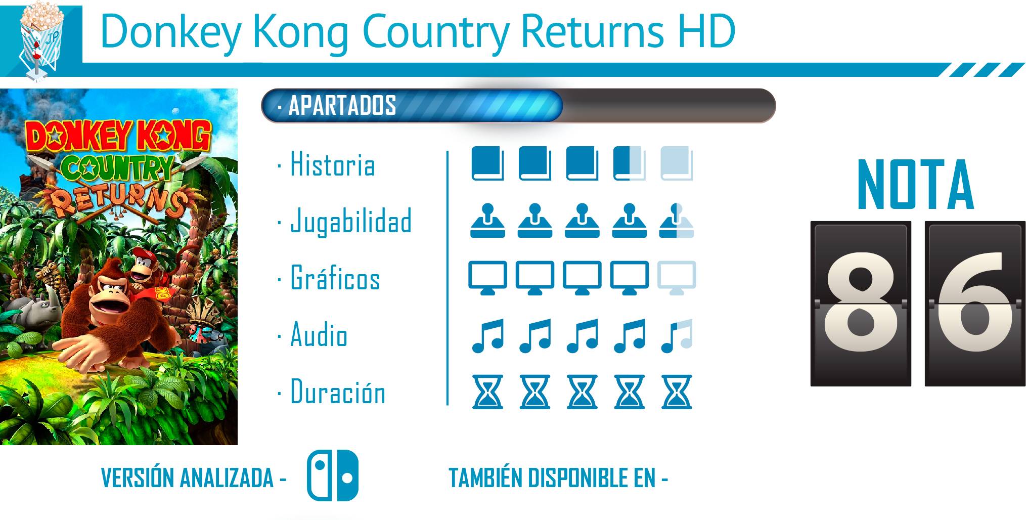 Por lo tanto, nos encontramos ante un nuevo port de ese divertido juego que ya pudimos disfrutar en Nintendo Wii y 3DS, cuyos añadidos dan un nuevo lavado de cara a la aventura para que esté a la par de las características técnicas de Nintendo Switch, pero además mantiene esos añadidos que pudimos ver en la entrega de 3DS para hacer que este Donkey Kong Country Returns HD sea la entrega definitiva.