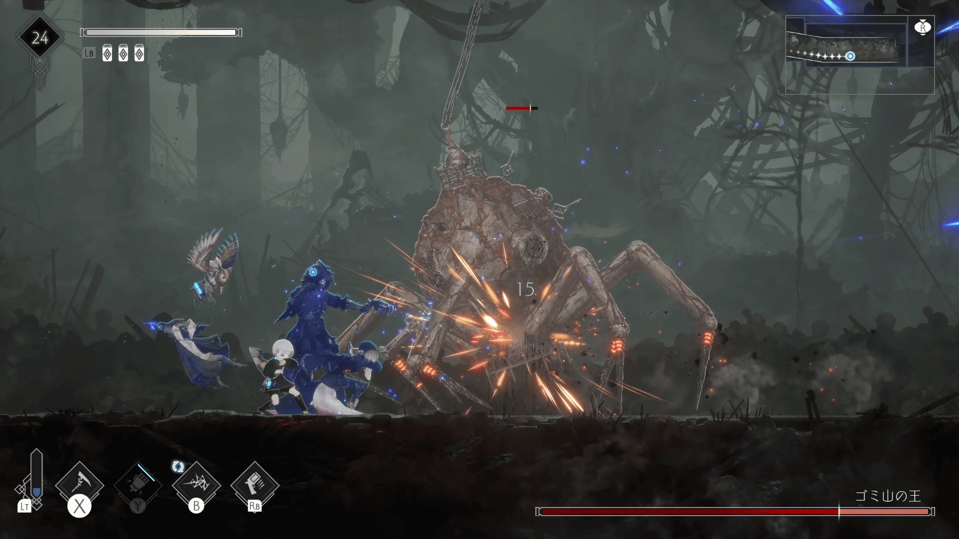 El juego también presenta batallas contra jefes, que son uno de los puntos más destacados en términos de jugabilidad. Los jefes requieren que el jugador use todo su arsenal de habilidades, tanto de Lilac como de sus homúnculos, para superar desafíos complejos. Estos combates son largos y exigentes, pero están diseñados para ser muy satisfactorios, ya que cada victoria se siente como un logro significativo. Los patrones de ataque de los jefes son variados y requieren de un enfoque táctico y preciso para ser derrotados, lo que mantiene al jugador en tensión y totalmente involucrado.