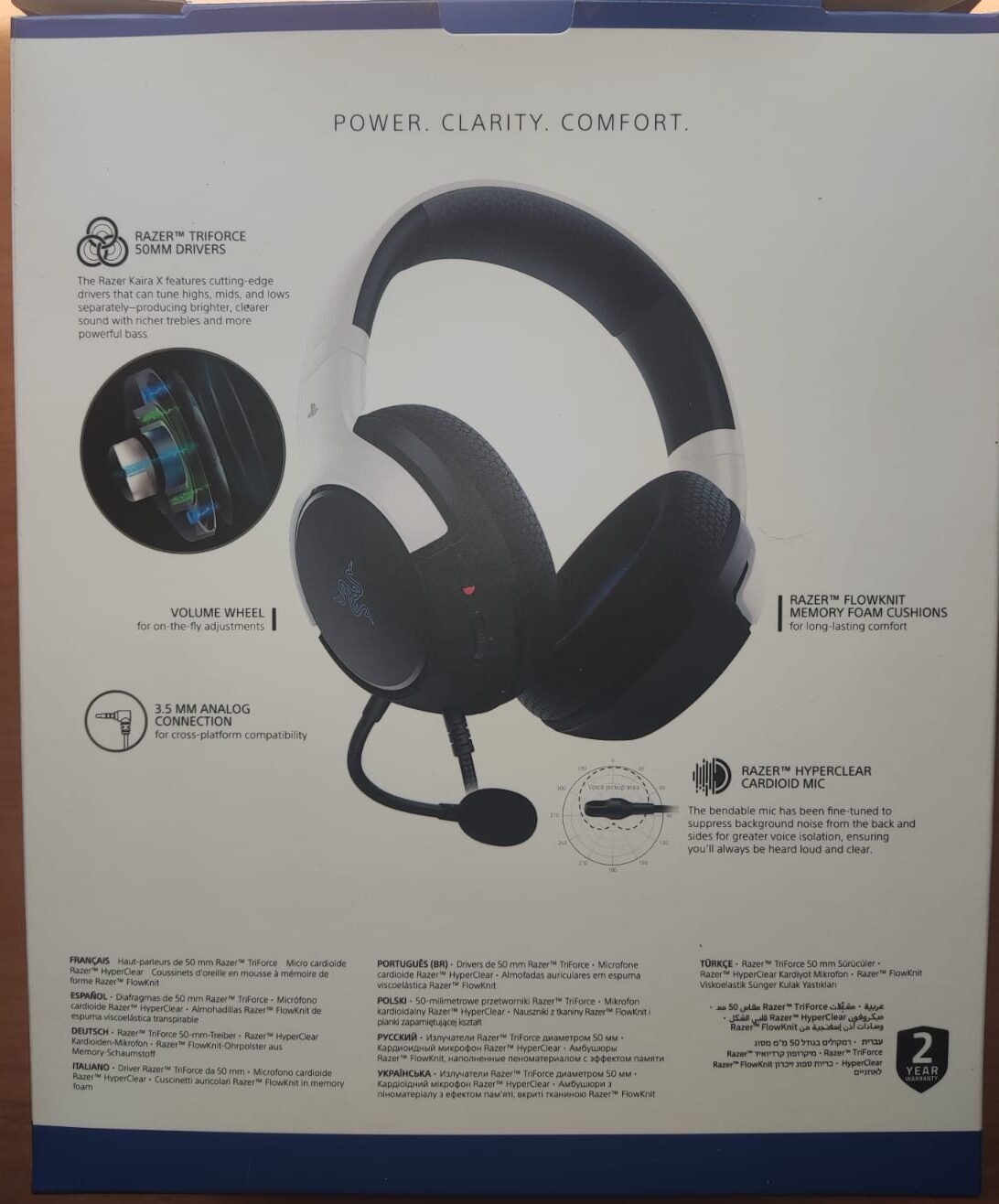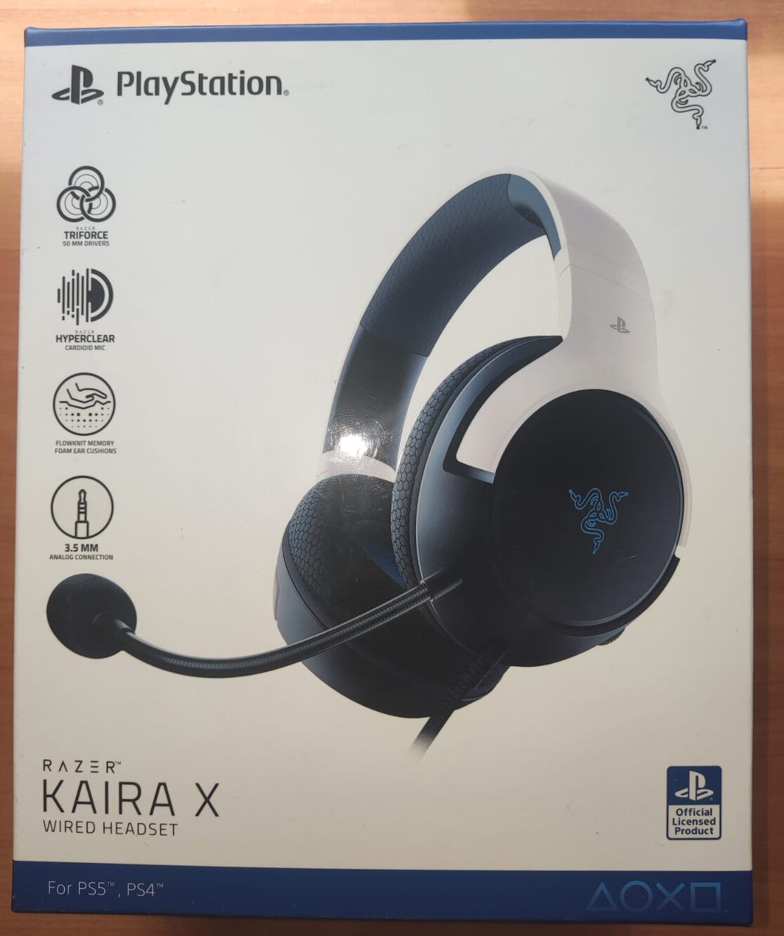 El primer contacto con el Razer Kaira X se da a través de un empaquetado sencillo, pero sumamente funcional, que encierra la filosofía de la marca en cada detalle. La caja, de diseño limpio y profesional, exhibe la imagen corporativa de Razer con un toque especial en blanco que alude a su colaboración con PlayStation, resaltando la modernidad y el minimalismo del producto.