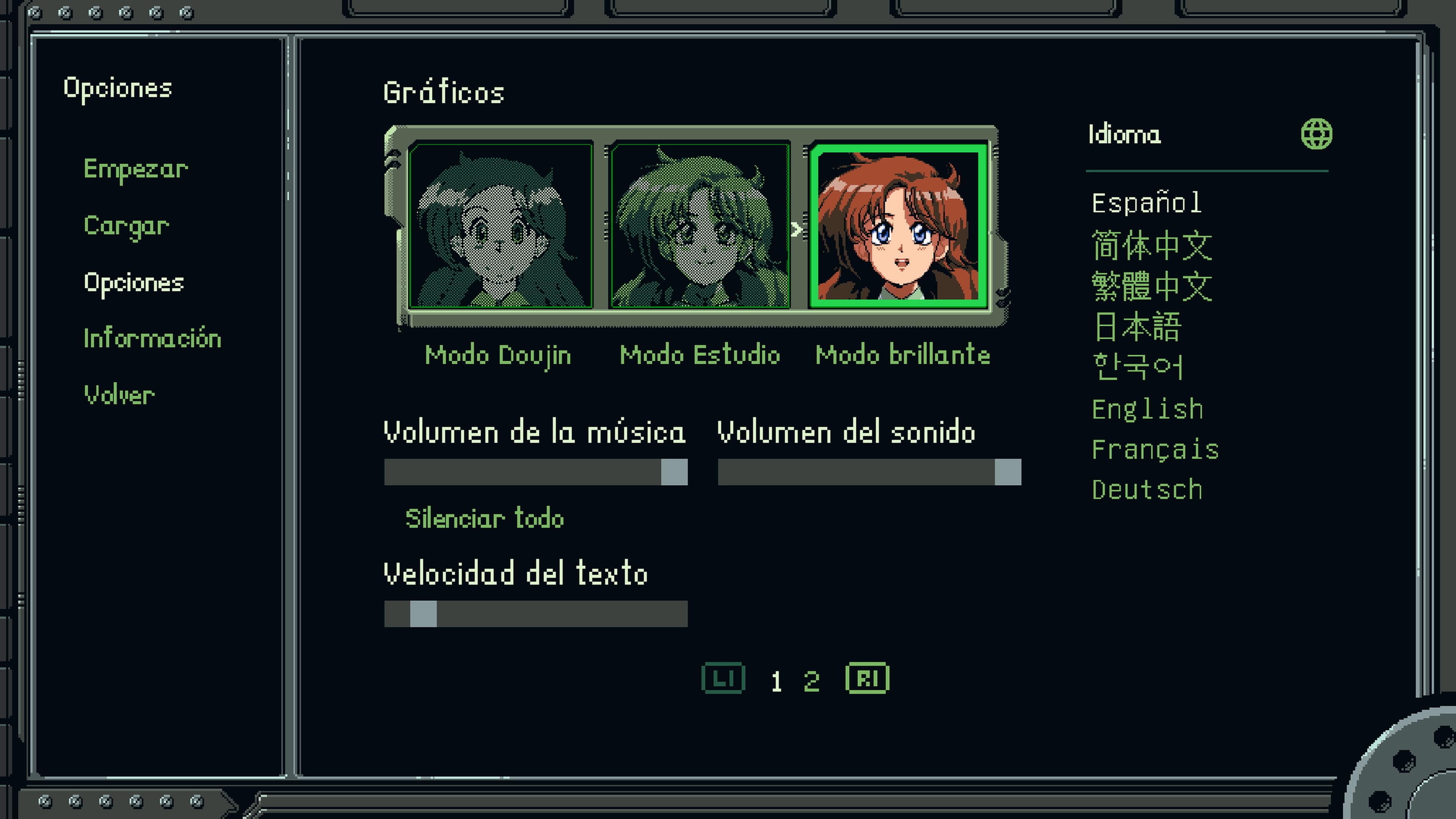Además, el juego permite activar efectos de scanlines para reforzar el estilo retro y seleccionar entre dos tipos de letra para los textos: una retro y otra moderna.
