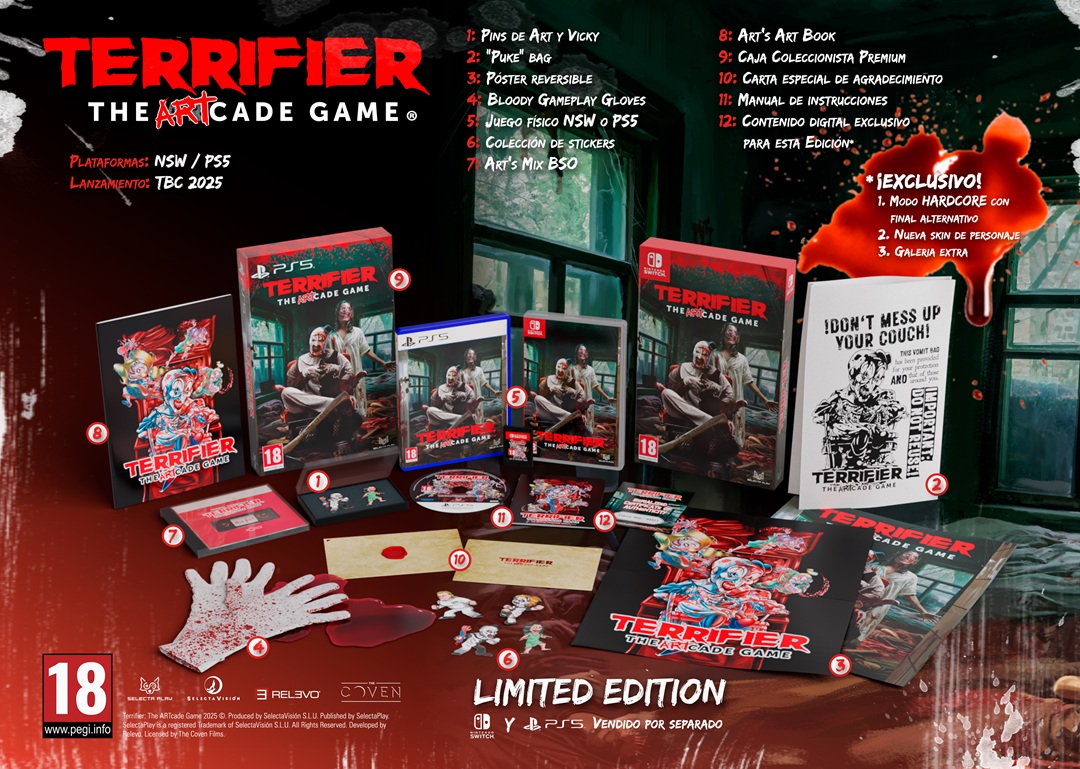 Selecta Play anuncia las ediciones físicas limitadas de Terrifier The ARTcade Game. Este brutal juego de lucha se lanzará en 2025 para Steam, Nintendo Switch, PlayStation 5 y Xbox Series X|S, ofreciendo a los fans la oportunidad de adentrarse en el caos del mundo de Art el Payaso. Con influencias de clásicos de los arcade, es una mezcla ensangrentada de nostalgia retro y locura multijugador moderna.