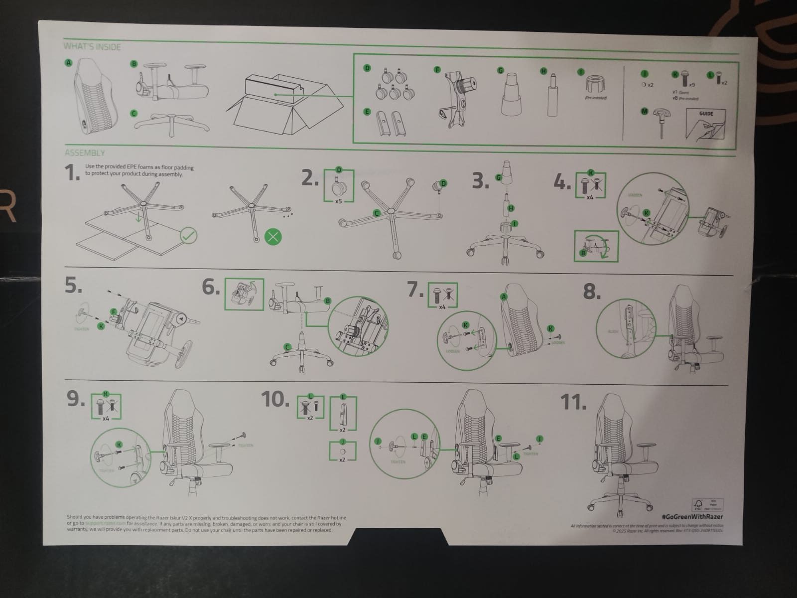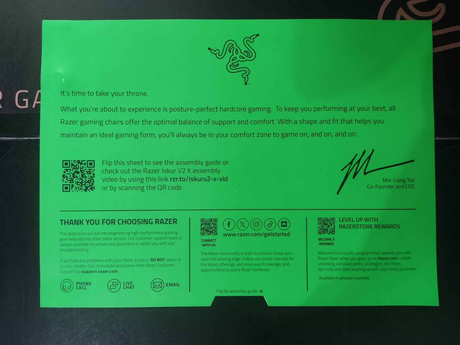 Tras esto, encontramos la tarjeta de agradecimiento de Razer, un pequeño gesto que personaliza la experiencia y que, por su parte trasera, se encuentran las instrucciones de manera esquemática de cómo se ha de montar la silla, en sencillos pasos que recomendamos seguir.