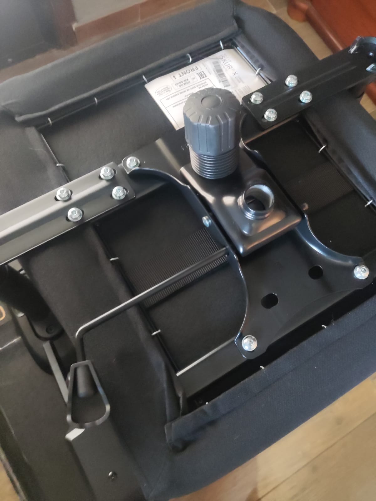 Tras esto colocaremos la estructura del asiento sobre el tronco con amortiguación. Para ello utilizaremos la llave tipo Allen que se incluye y los tornillos proporcionados para fijar el asiento al tronco. Es importante apretar los tornillos de manera uniforme para evitar cualquier inclinación o inestabilidad.