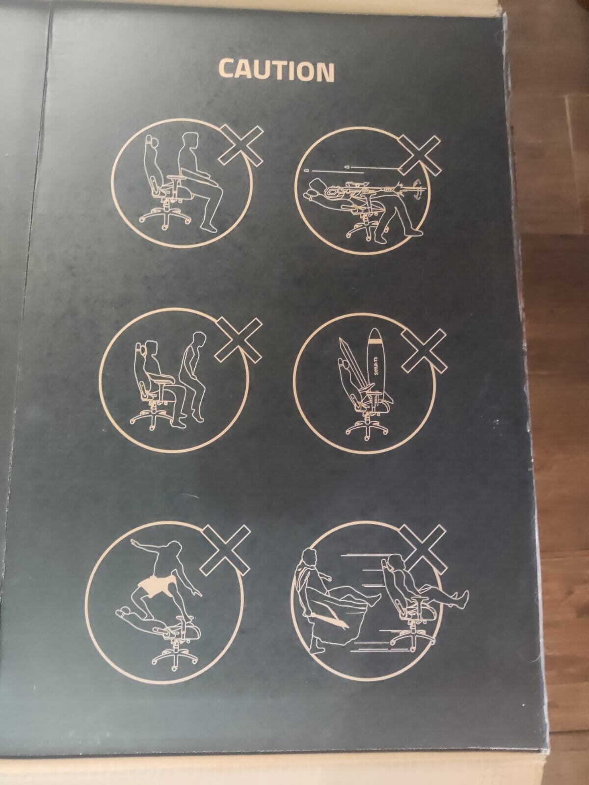 Tras esto, y antes de ver la propia silla, vemos un detalle que saca una sonrisa, pues en las solapas internas de la caja, Razer ha incluido una simpática infografía con cosas que no debes hacer con la silla: desde utilizarla como monopatín hasta lanzarte por las escaleras como si fuese un trineo.