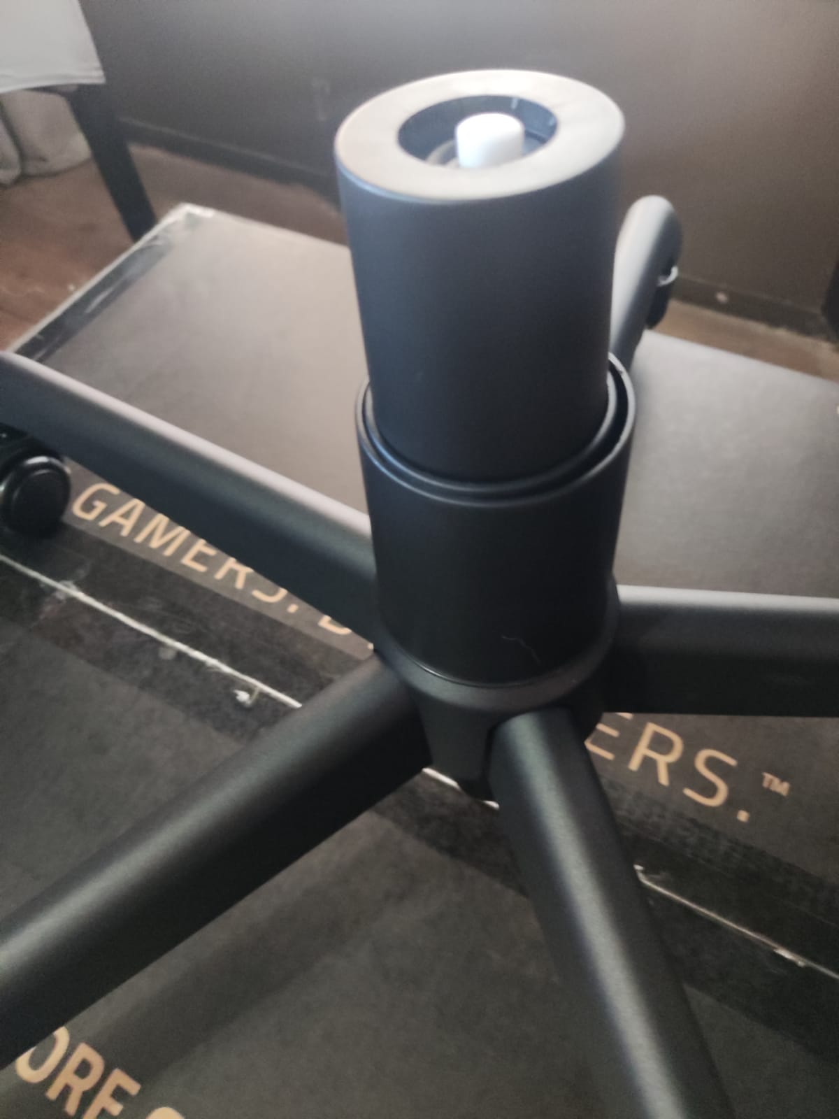 Una vez colocadas las ruedas, colocaremos el pistón de amortiguación en el centro de la base, asegurándonos de que encaje correctamente para garantizar la estabilidad de la silla.
