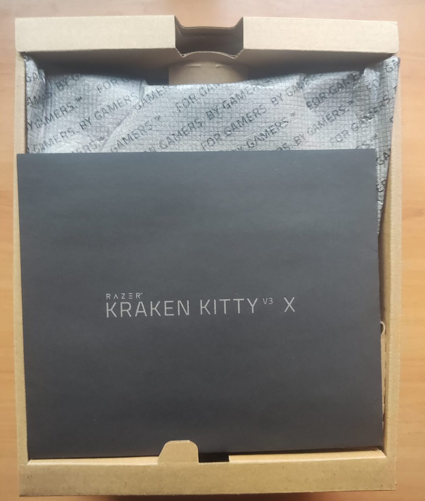 Justo debajo aparece lo que realmente nos interesa: los auriculares. Vienen dentro de una estructura de cartón diseñada al milímetro para que no se muevan durante el transporte, y además están protegidos por una bolsa acolchada de color gris que les da un extra de seguridad. Cuando los sacamos de ahí y tenemos por fin el periférico en las manos, se siente como ese momento especial de cualquier unboxing gamer: el primer contacto directo con los Kraken Kitty V3 X, listos para probar y comprobar si cumplen con todo lo que prometen en la caja.