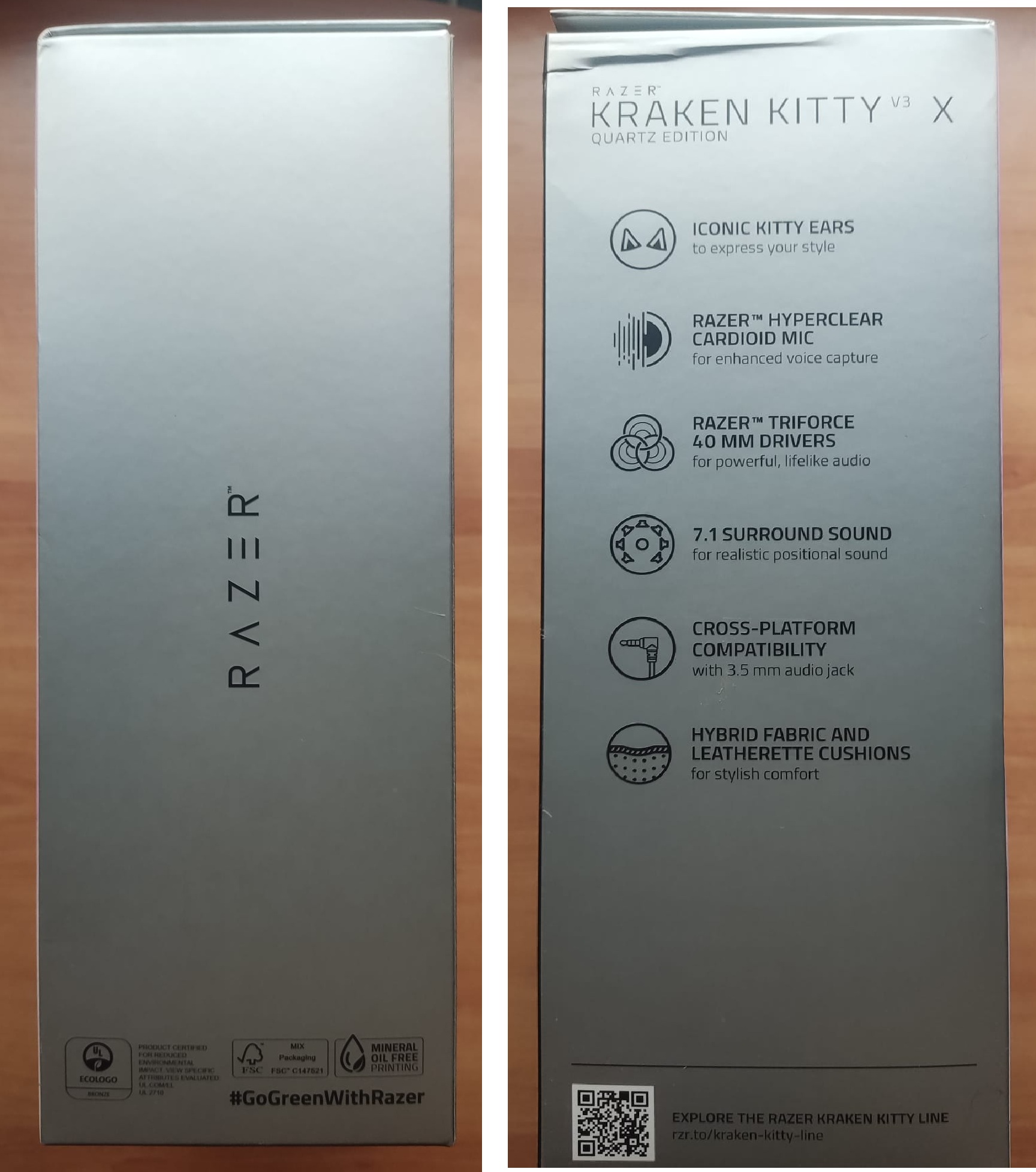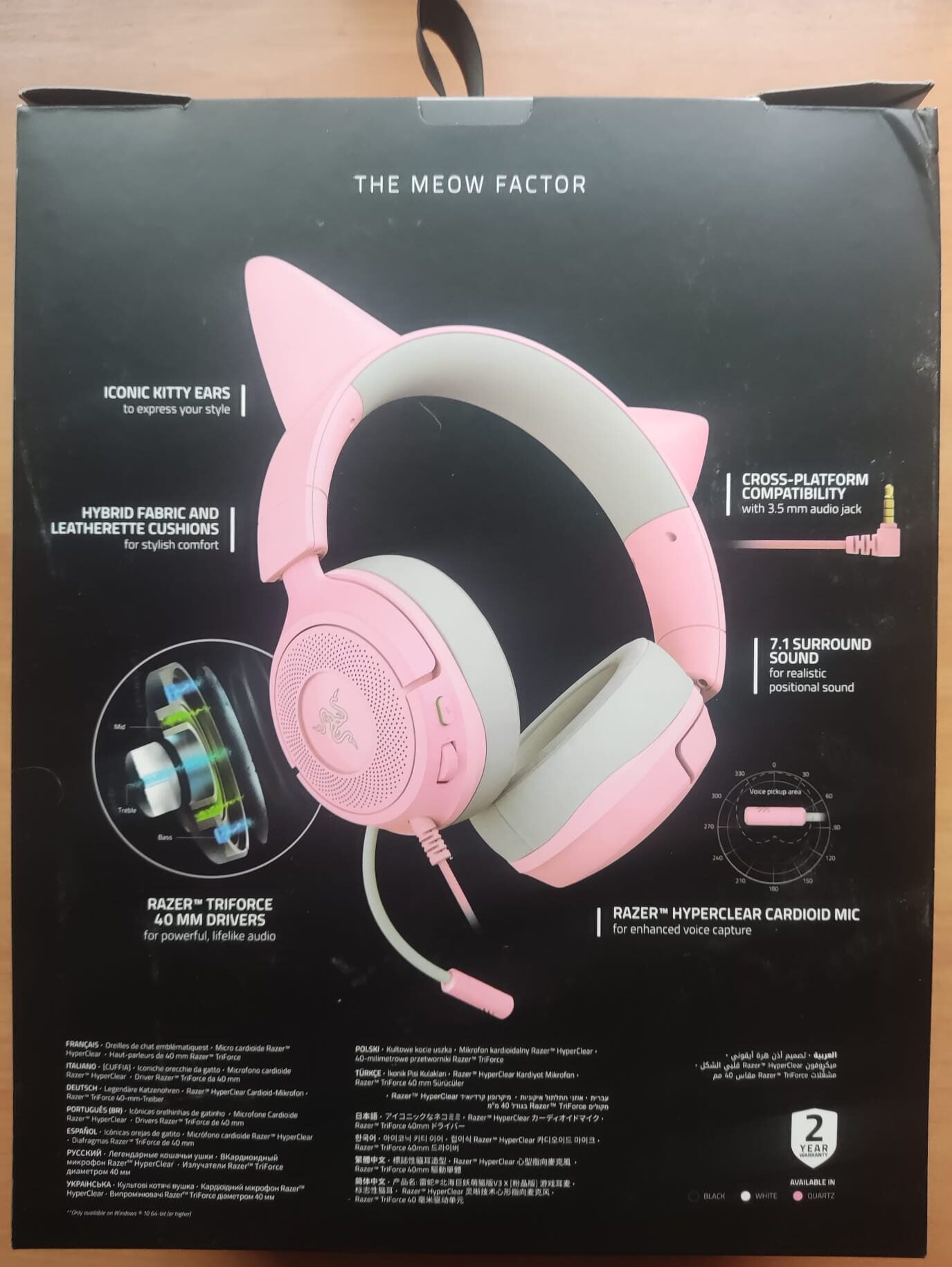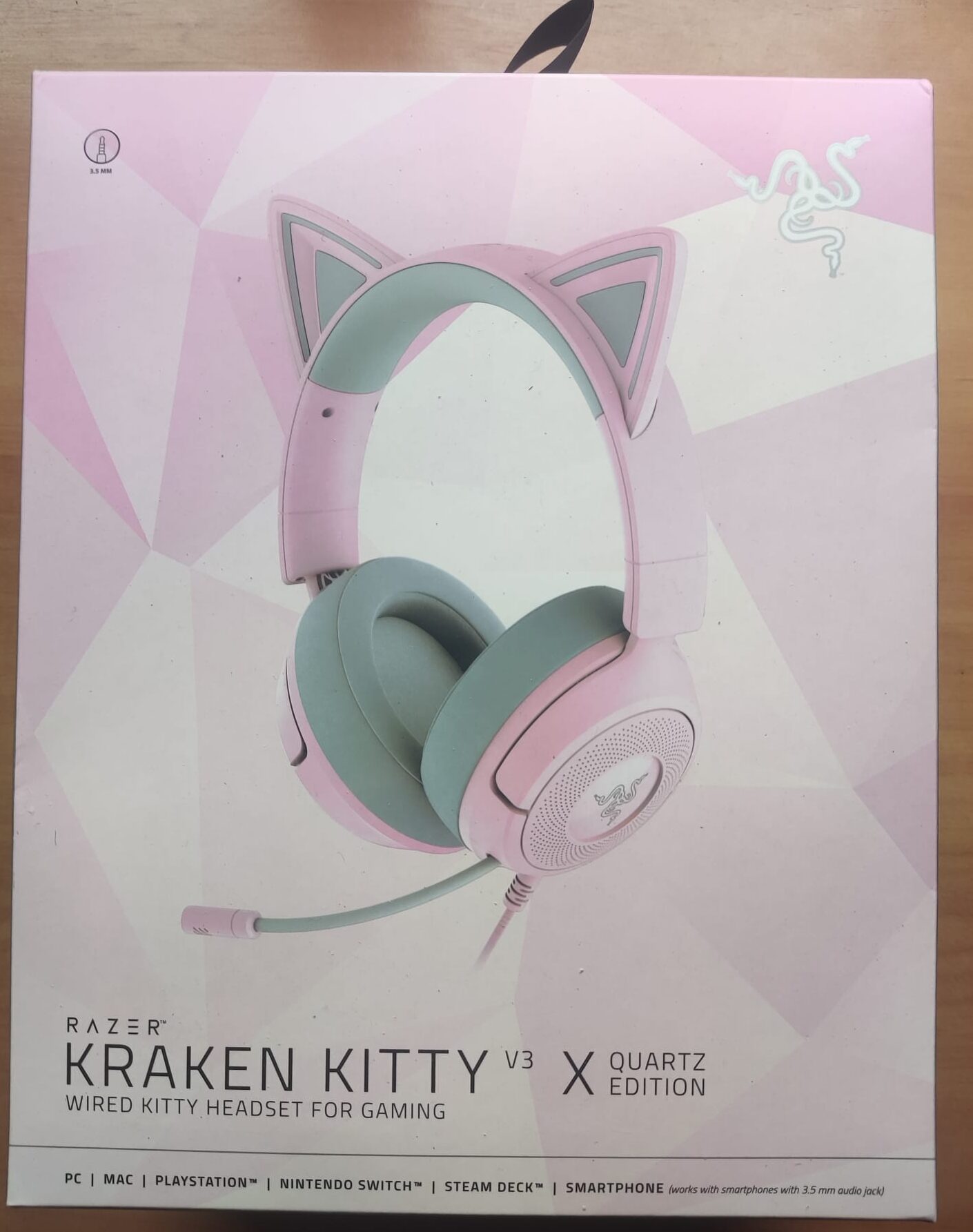La caja del Razer Kraken Kitty V3 X ya marca la diferencia desde el primer vistazo. Se presenta en color gris, muy en la línea de lo que suele hacer Razer, pero aquí cambia el mítico verde de la marca por un llamativo rosa que encaja con la estética de esta edición.