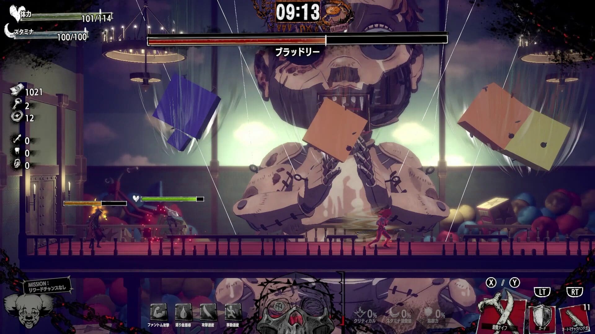 Morirás. Muchísimo. Pero el juego también te da ciertas herramientas para que esas muertes no sean del todo en vano. Una de las más importantes es el medidor de baño de sangre. Cada vez que eliminamos enemigos cuerpo a cuerpo, el medidor se llena un poco, y si logramos completarlo podemos invocar al mismísimo Doctor Carnival, que limpia la pantalla de rivales y causa un daño brutal a los jefes.