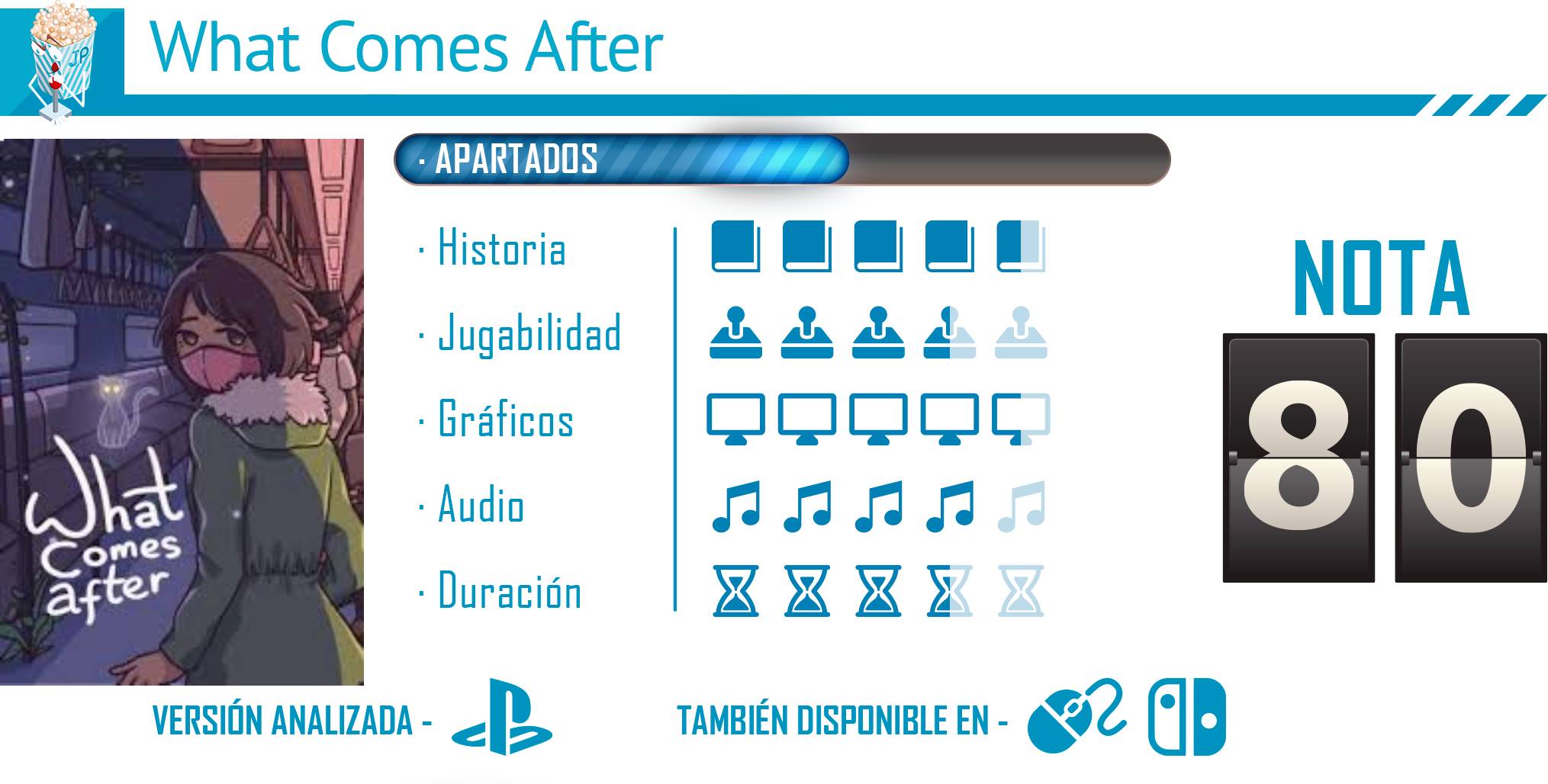 What Comes After no busca deslumbrar con mecánicas complicadas ni gráficos espectaculares, sino que se centra en crear una experiencia íntima y emocional. Cada vagón del tren, cada conversación y cada detalle son una invitación a detenerse, escuchar y reflexionar sobre la vida, la muerte y el valor de cada momento. Con un apartado visual sencillo pero expresivo, una música que acompaña sin imponerse y un ritmo pausado que deja espacio para sentir, el juego logra quedarse contigo mucho después de apagar la consola, demostrando que a veces lo más simple es lo más poderoso.