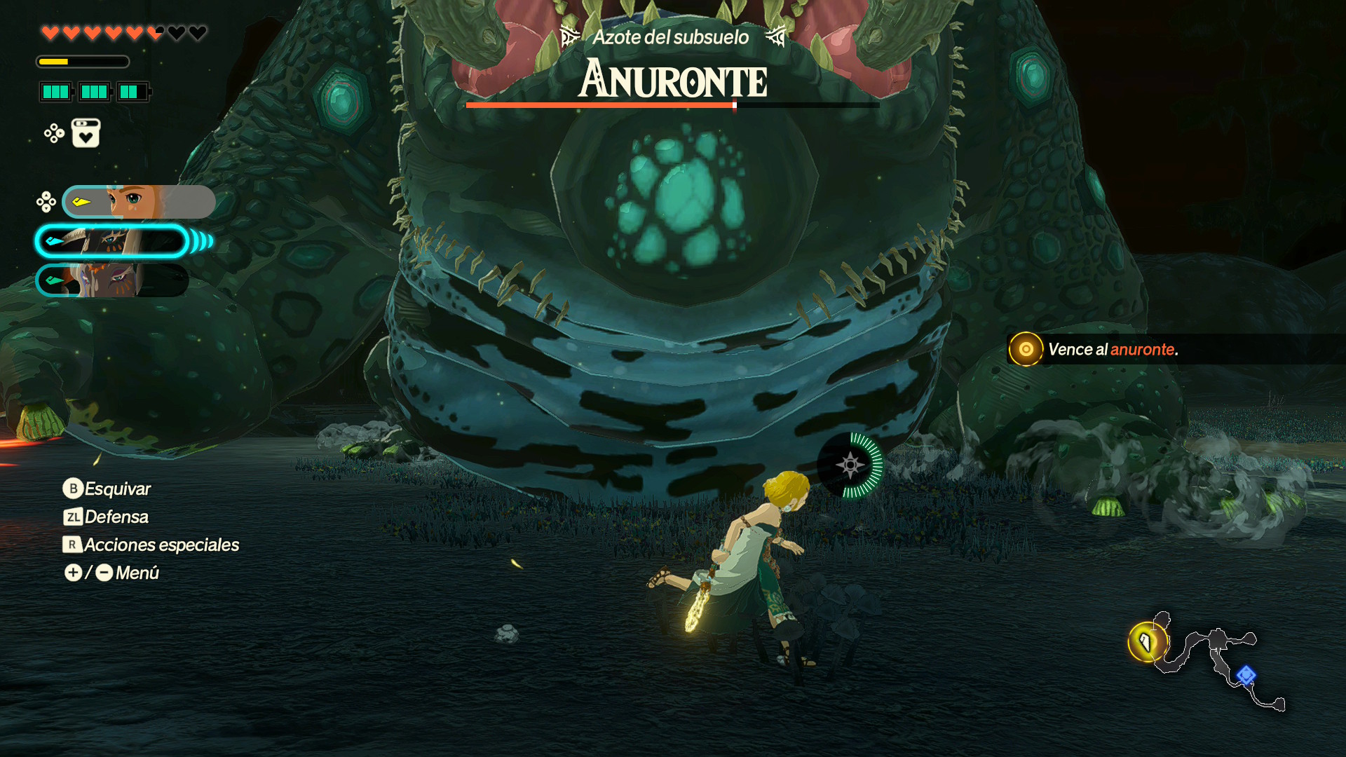 El mapa sigue el patrón de La era del cataclismo: una red de misiones, encargos y desafíos que puedes seleccionar con libertad. Es un sistema que ya funcionaba entonces, y que ahora se mantiene prácticamente intacto salvo por dos cambios clave. El primero, que el mapeado está corrompido y hay que liberarlo a base de misiones. El segundo, que no luchamos solo en la superficie de Hyrule, sino también en islas celestes y el subsuelo, reflejando la escala triple de Tears of the Kingdom. La variedad es amplia, sí, pero la fórmula base sigue siendo la de atacar posiciones, limpiar bases y enfrentarte a un jefe al final del trayecto.